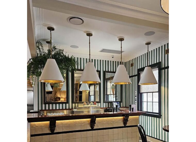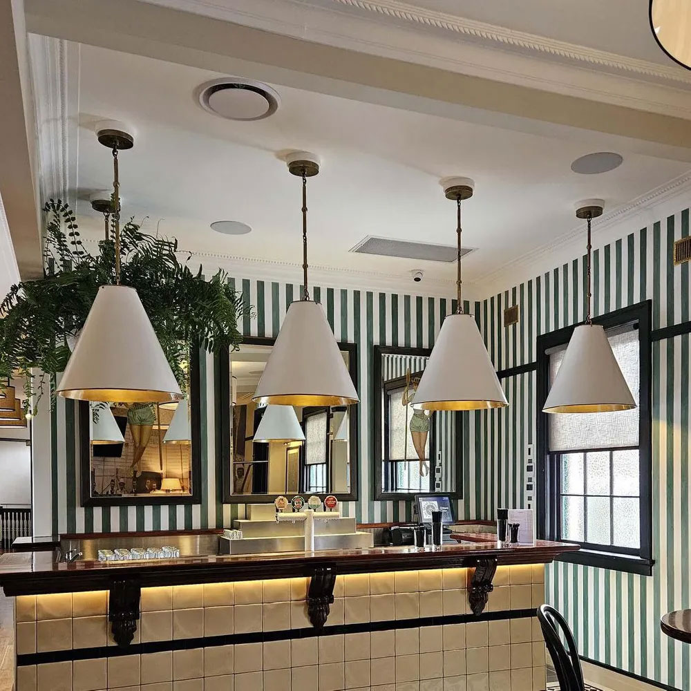 The brass lining inside gives warm ambience lighting to a directed overhead light effect to any space.