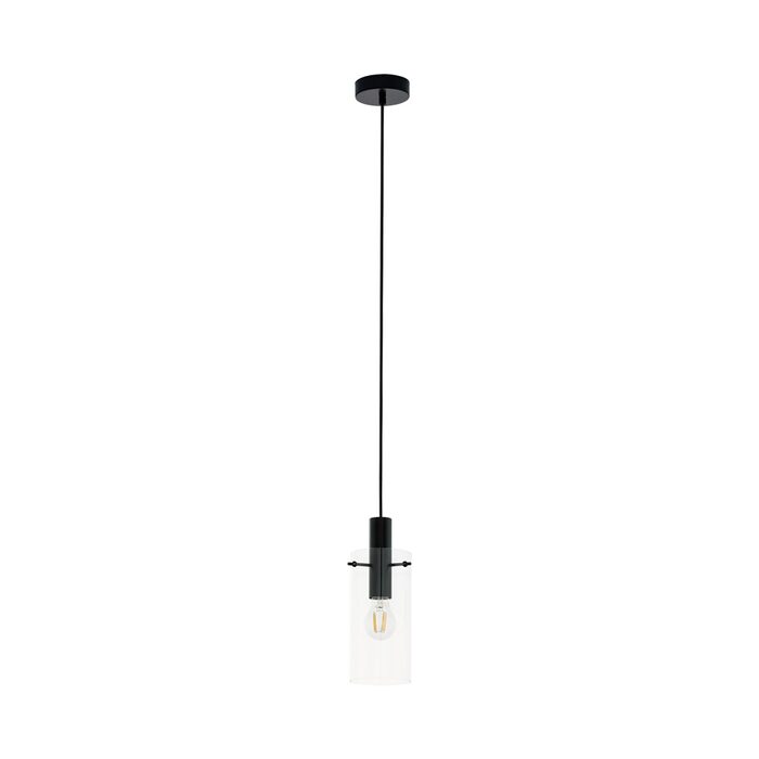 The Montefino pendant features a clear cylindrical glass panels suspended from a black cord and a black canopy.