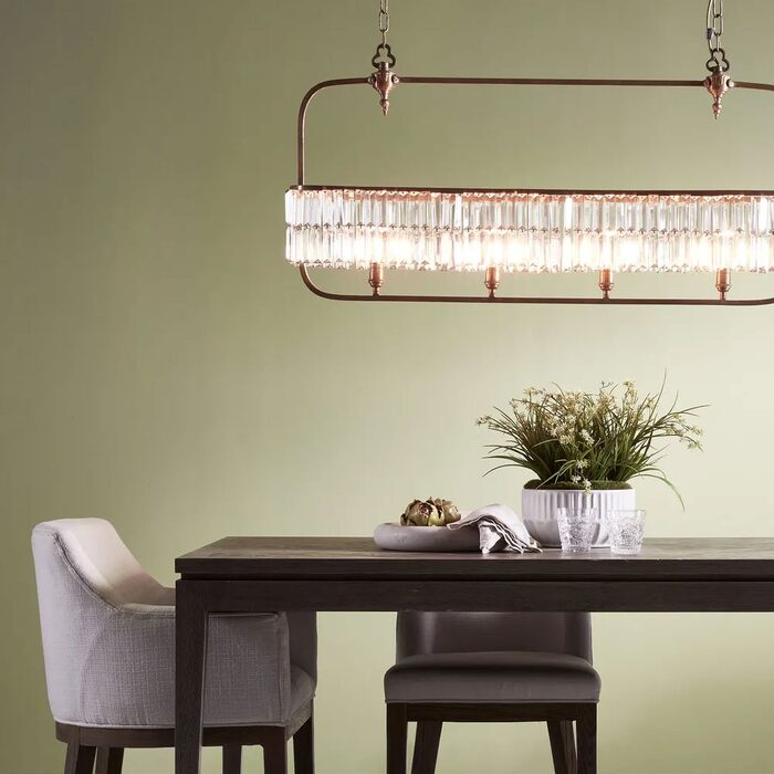 The lamp is hung by two chains that are arranged in a linear pattern along the length of the frame.