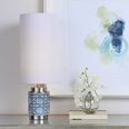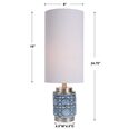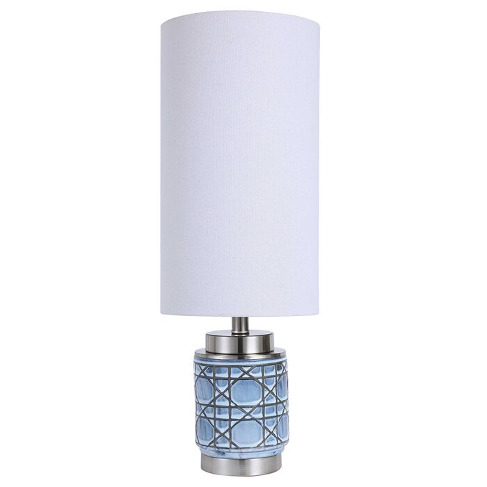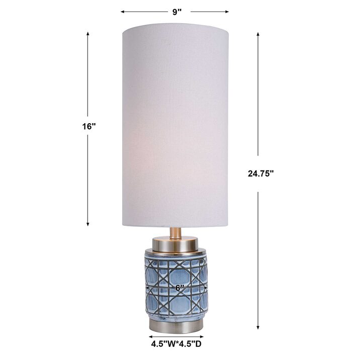 Ceramic buffet style lamp showcases a light blue glaze with a rust brown raised geometric design paired with brushed nickel plated accents.
