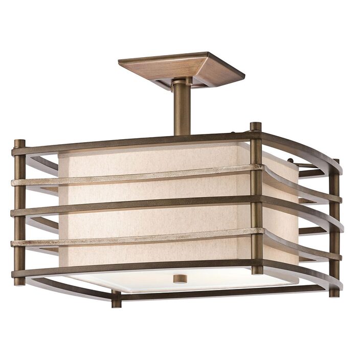 A rectangular linen fabric shade and white etched glass diffuser soften the look.