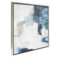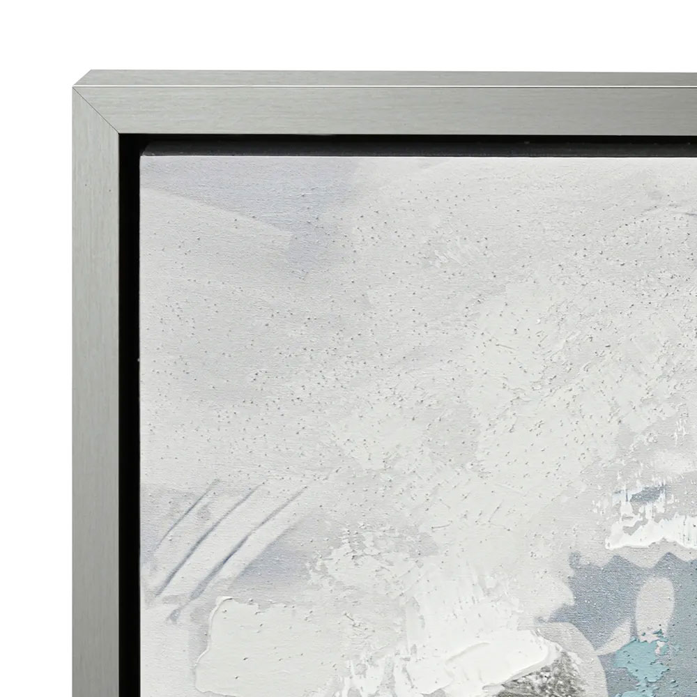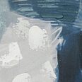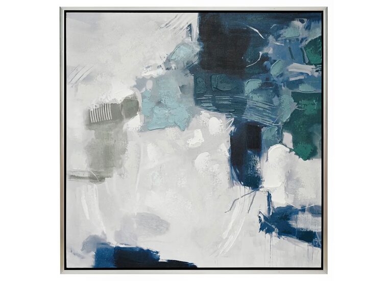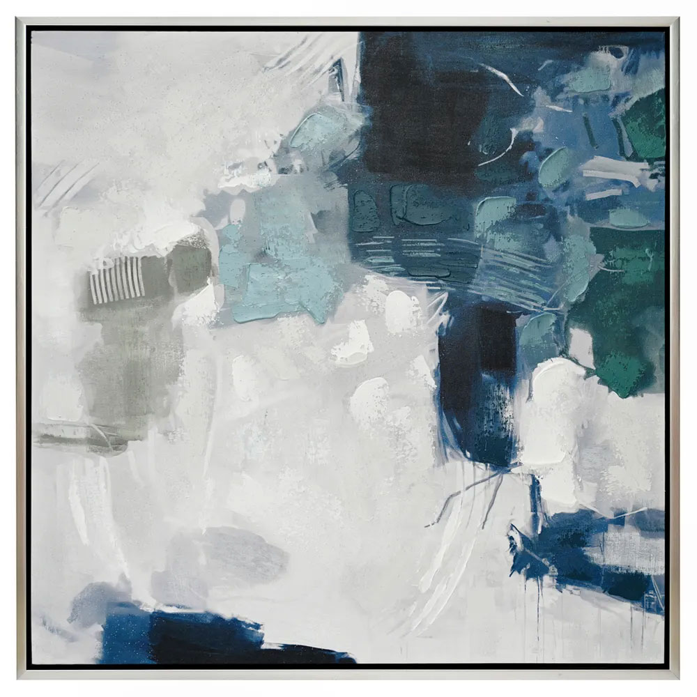 Creating a balanced composition through bold gestural brushstrokes and geometric abstraction, Ms. Verne combines tones of snow, aquamarine blues and teal with gentle accents of grey and sky blue.