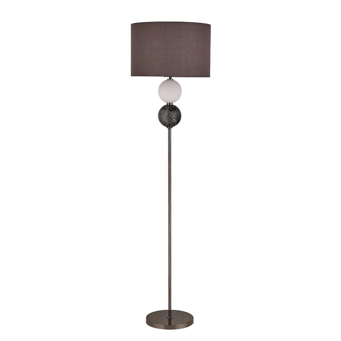 The Murano lighting series feature matching floor and table lamps that combine cylindrical and spherical shapes with matte and textured glass with brass or pewter metallic accents that support the fabric lampshade.