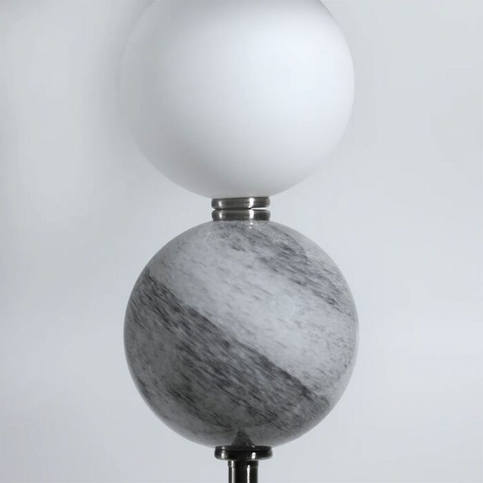 Two glass orbs separated by thin metallic rings sit above the metal base.
