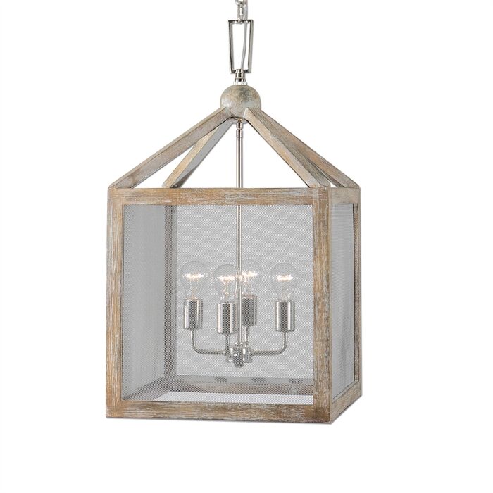 Grey taupe washed wooden lantern with polished nickel accents featuring screened sides giving a classic american back porch feeling to this unique fixture.