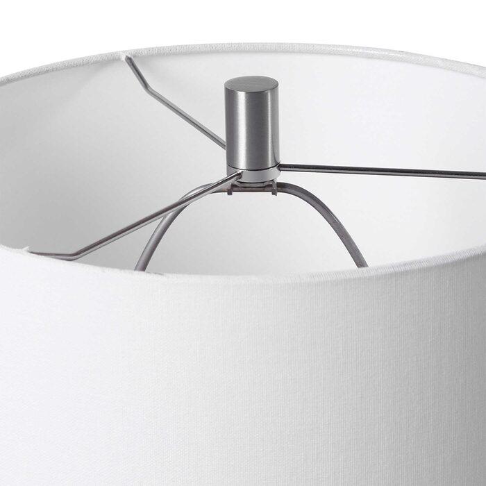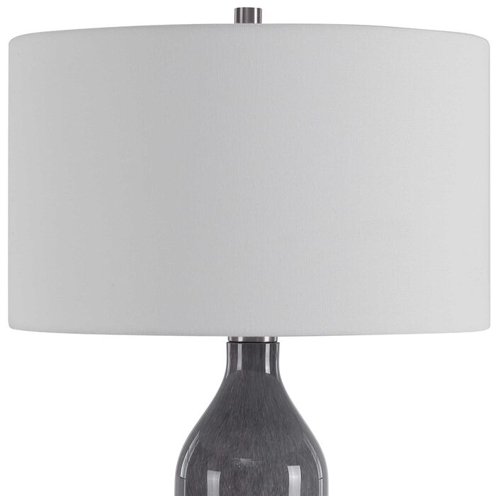 Perfect for any room style, this art glass table lamp features a transitional style with an light gray and frosted white ombre look, displayed on a thick crystal foot accented with brushed nickel details.