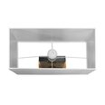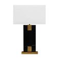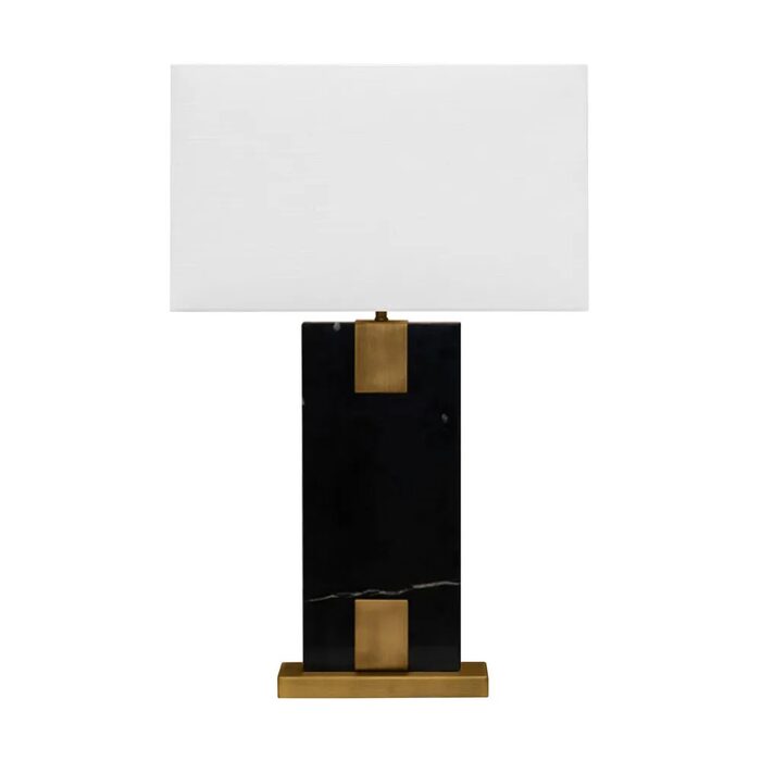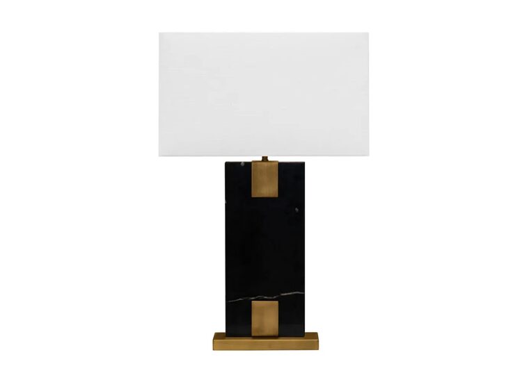 The lamp’s white rectangular shade provides a crisp contrast to the architecturally inspired base, bringing an air of understated luxury to any room.