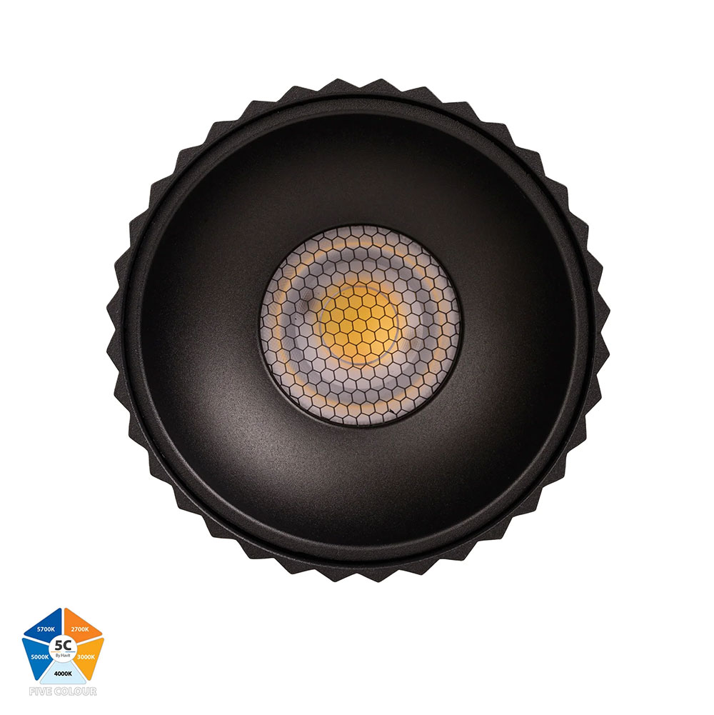 The HV5854S-BLK-12V is a Havit Lighting "Nella" 24W surface-mounted LED downlight with a black powder-coated aluminium finish, suitable for both modern indoor and outdoor applications.