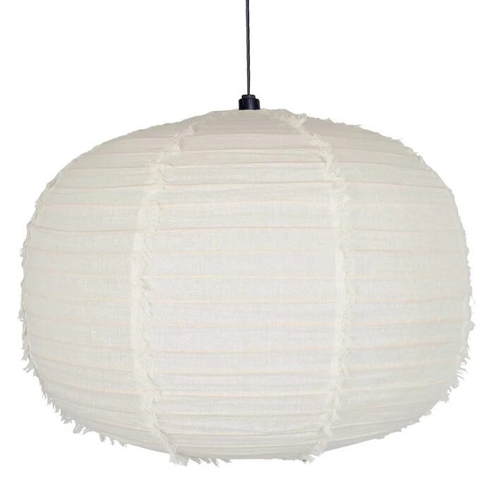 Its round, globe-shaped linen shade showcases hand frayed edges, imparting a rustic charm.