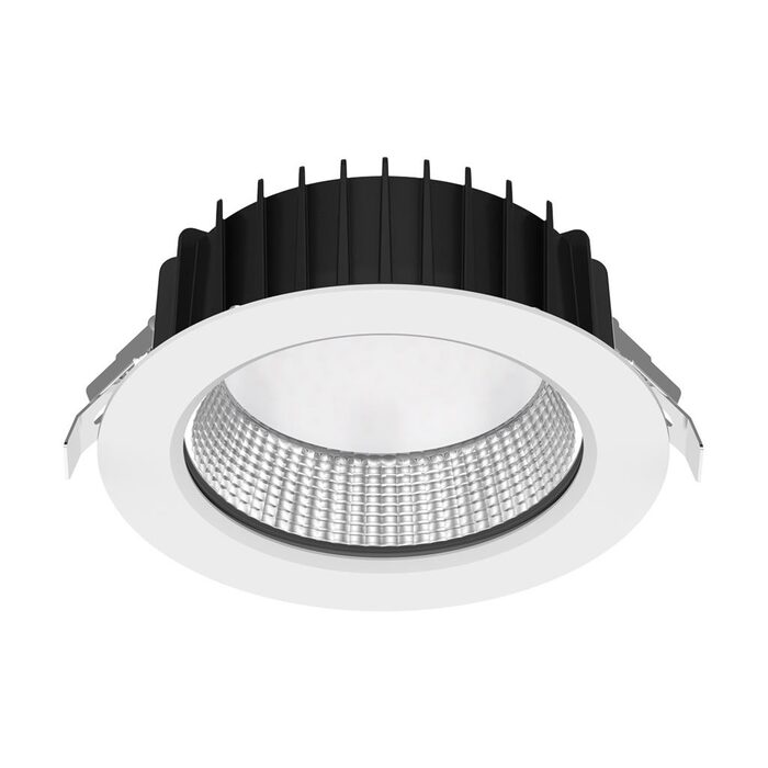 LED recessed downlight with anti-glare deep set frame, frosted diffuser, and an integrated dimmable LED driver with flex & plug. Fully dimmable with suitable dimmers.