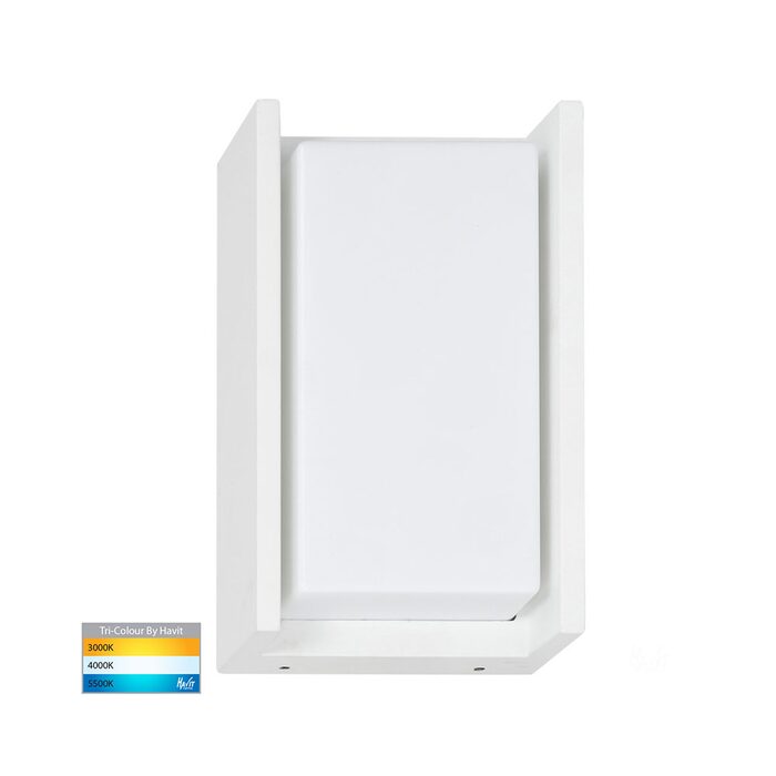 The HV3668T-WHT is the Havit Nepean 12W Tri-Colour LED Wall Light, a sleek, white, rectangular fixture made of aluminium with a polycarbonate diffuser.
