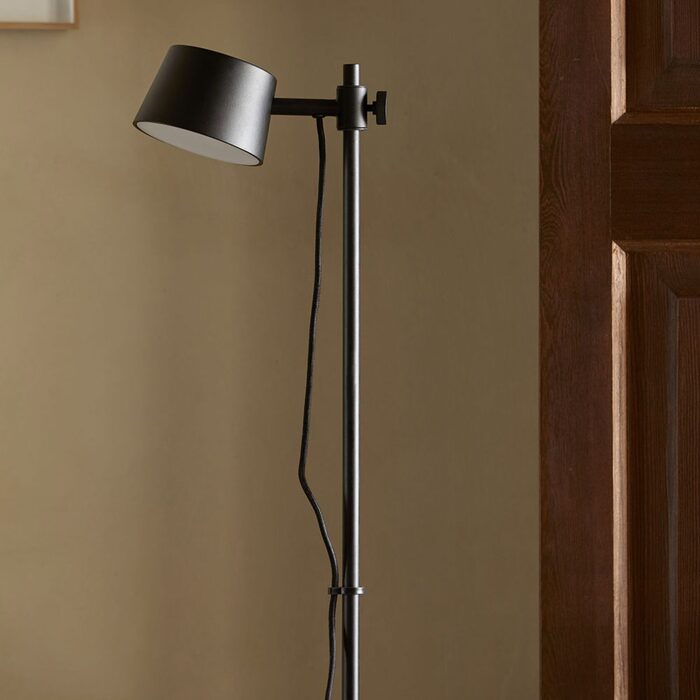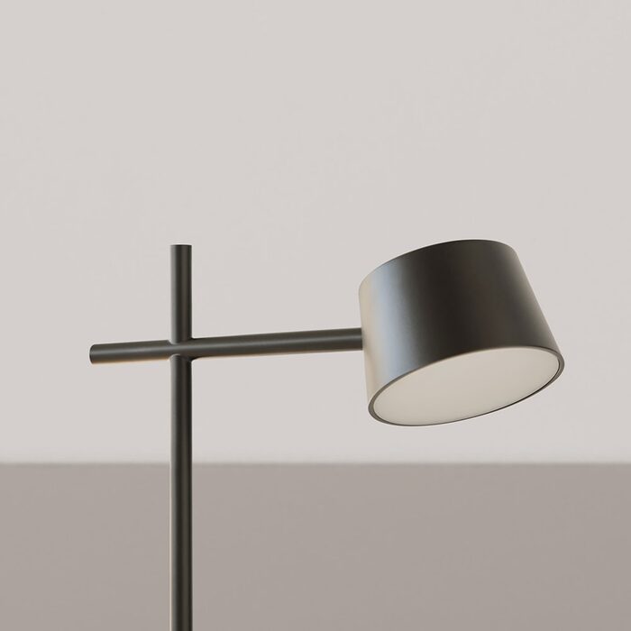 Nera features a minimal design with weighty characteristics, as seen by the composition of its tall cylindrical base and rounded shade.
