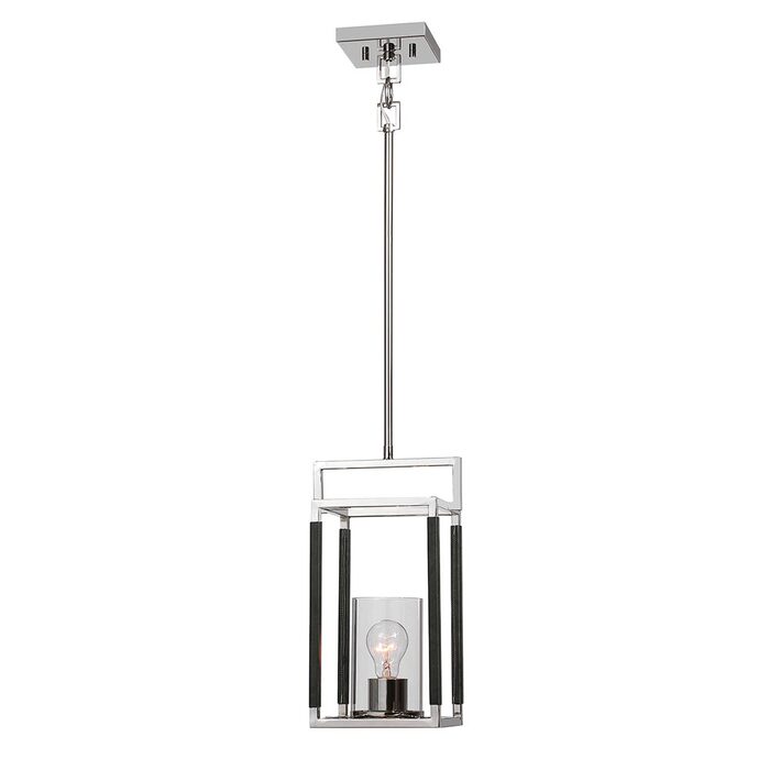 The clean geometric rectangular and square lines in polished nickel on our 1 Lt Mini Pendant are enhanced with hand sewn textured black leather accents.