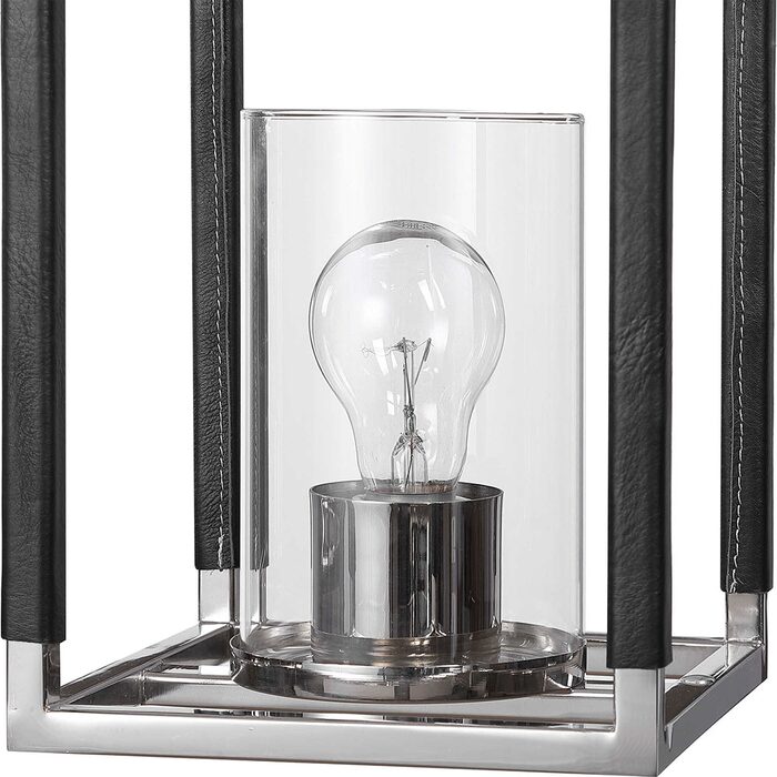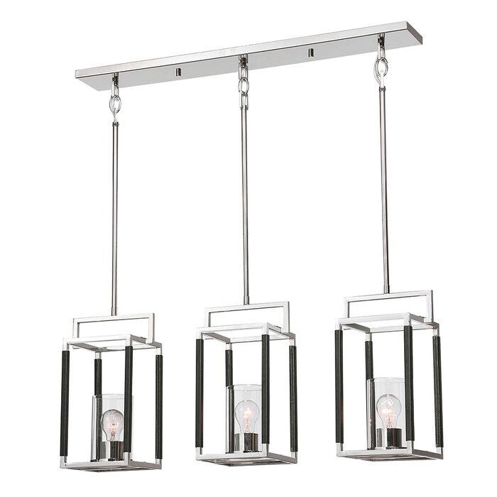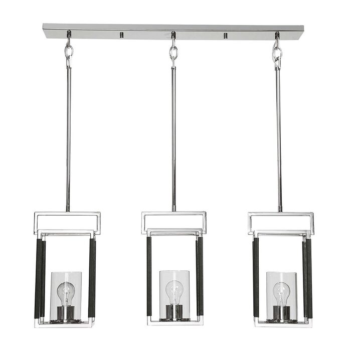 The clean geometric rectangular and square lines in polished nickel on our 3 Lt linear Pendant are enhanced with hand sewn textured black leather accents.