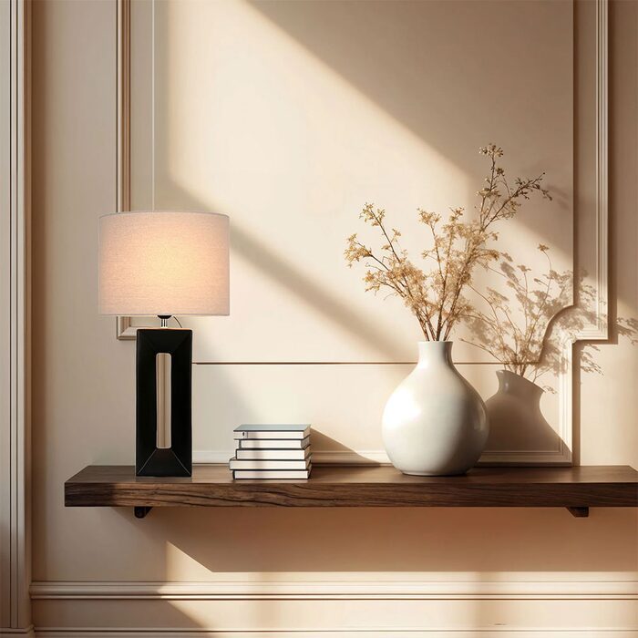 The matt black ceramic base is paired with a contrasting neutral cotton shade, making this lamp bang on-trend.