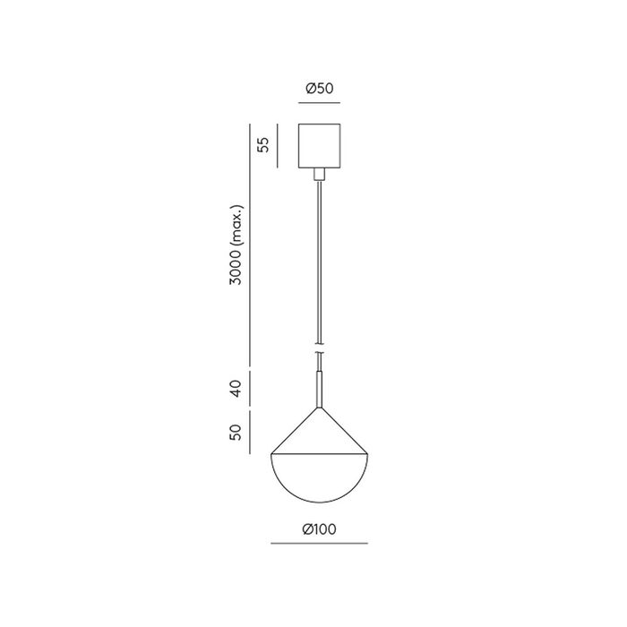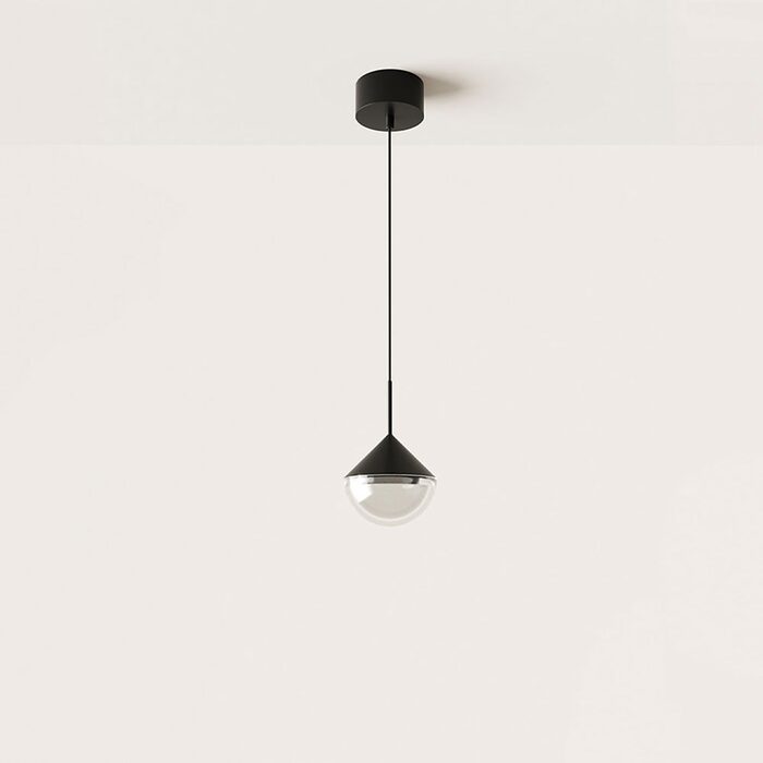 The spherical bottom conjures up a sense of solidity while the contrasting triangular top brings an overall lightness as it hangs from the suspension.