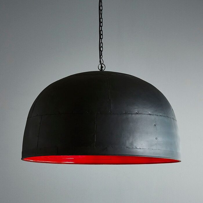 An over-sized riveted dome with a matte black exterior and a warm red interior.