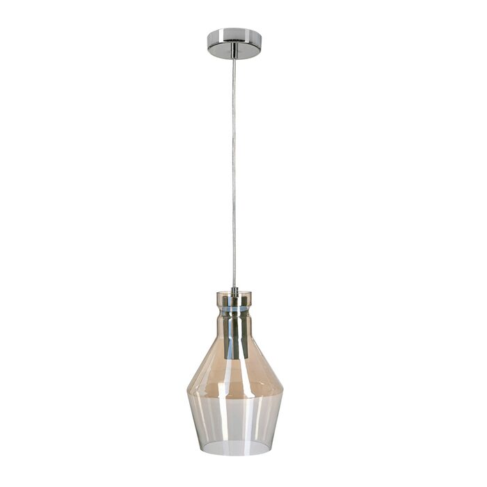 Cognac translucent glass shade with wood detail and chrome cord set. The wooden detail can be removed during installation. Fine hand crafted glass shade with an clear suspension.