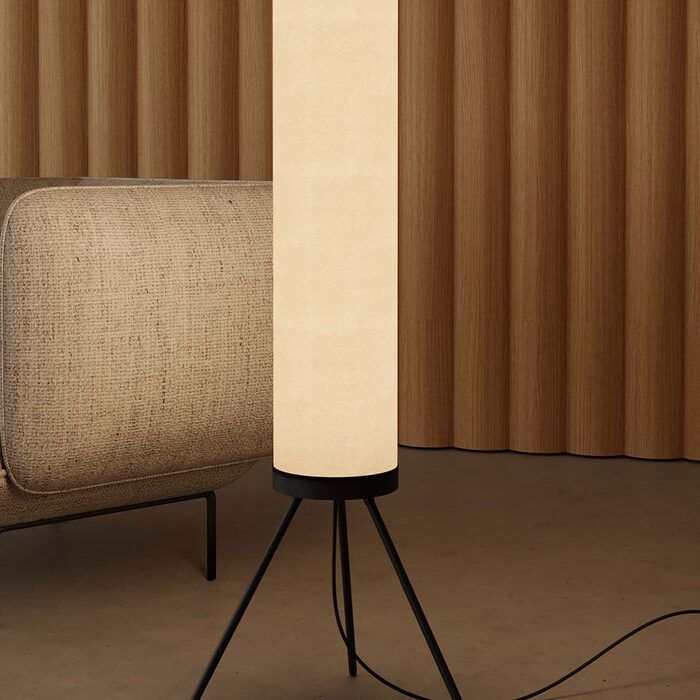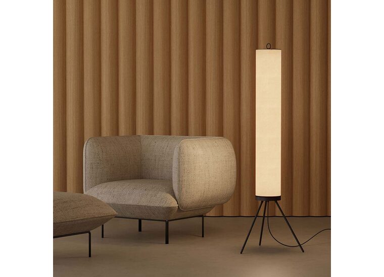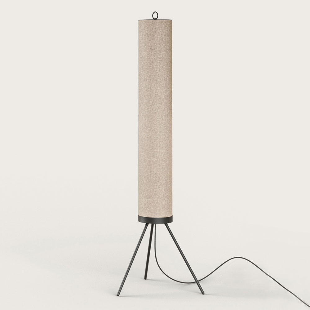 Nooi Floor Lamp by Aromas Del Campo combines a cylindrical shade and steel tripod to create a bold silhouette.