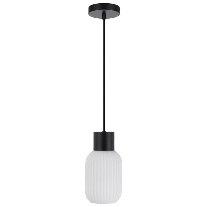 The glass is offered in opal matt, the metalware is a rich matt black, while the pendants are suspended with textile cable.