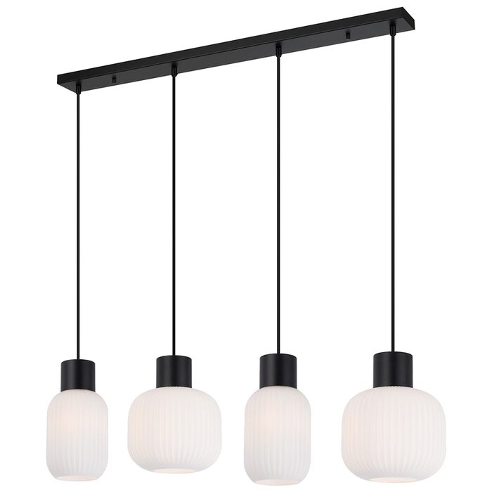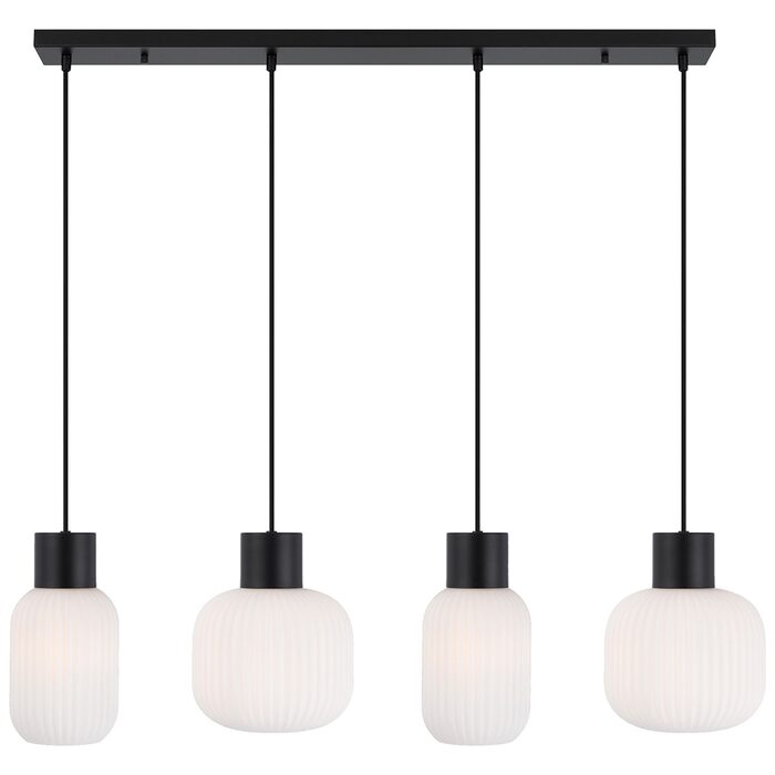 The glass is offered in opal matt, the metalware is a rich matt black, while the pendants are suspended with textile cable.
