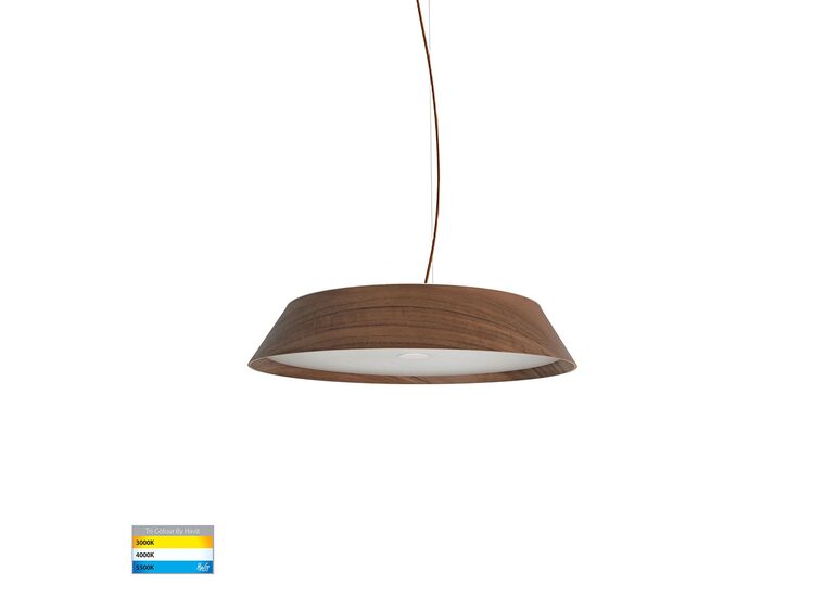The Havit HV5871T-PDT is a 330mm, 20W LED pendant light made with a walnut timber finish and a frosted polycarbonate diffuser, designed for indoor use in contemporary interiors.
