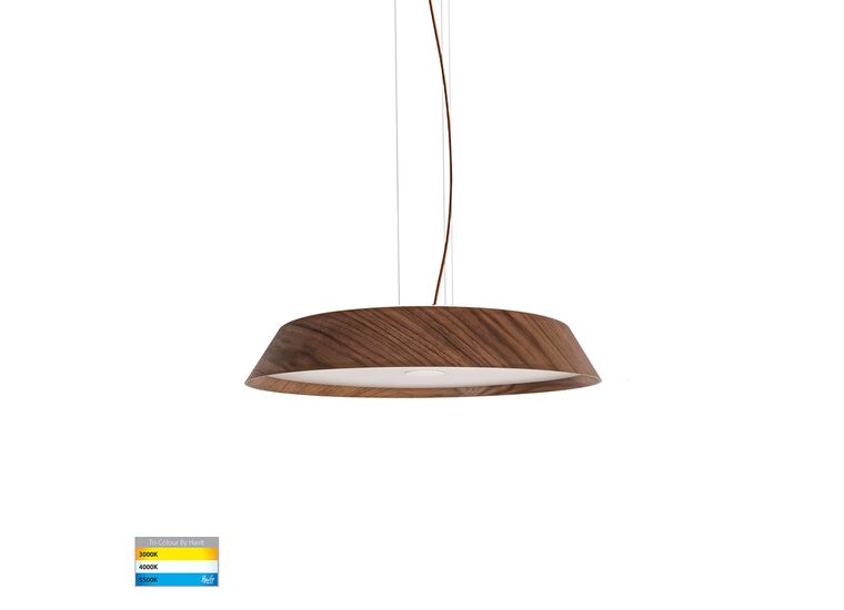 The HV5873T-PDT is a Noyer 510mm LED pendant light manufactured by Havit Lighting, featuring a modern design with walnut timber and a white diffuser.