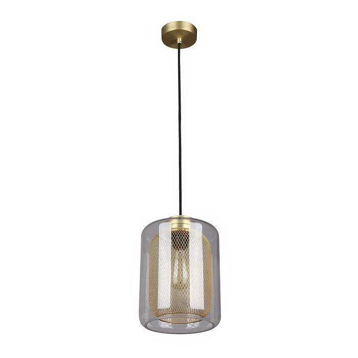 Series of modern glass pendants with black, copper or brass mesh inserts.