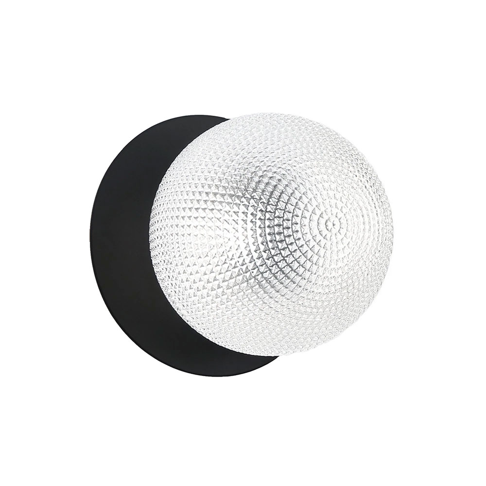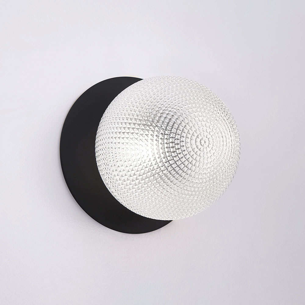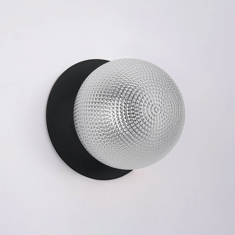 Each wall light pairs a sleek integrated LED module with your choice of round decorative base plate in Gold, Brass, Chrome, Matte White, or Matte Black, and a round glass shade available in Clear, Smoky, Marble Opal, or Frosted Opal, in 10 cm or 15 cm sizes.
