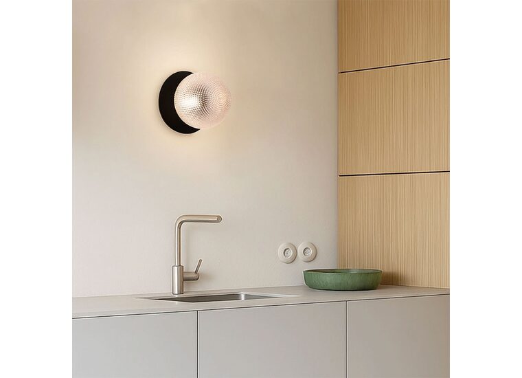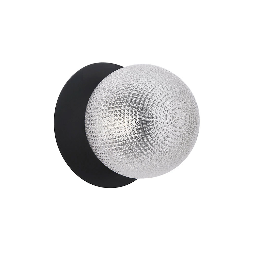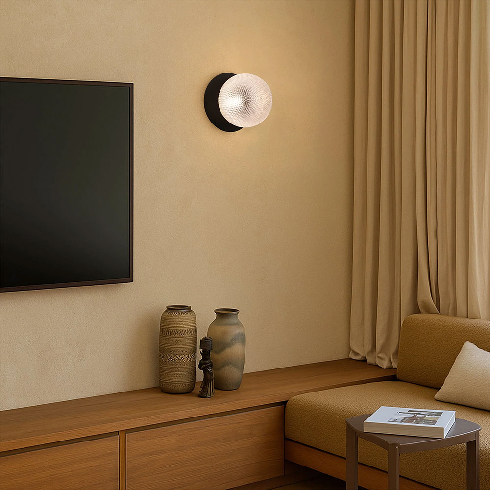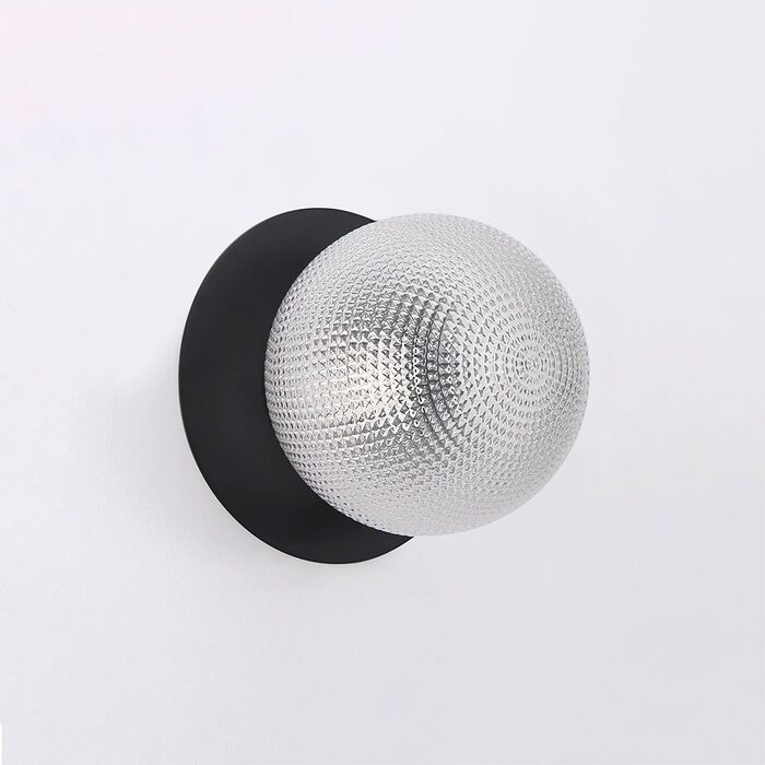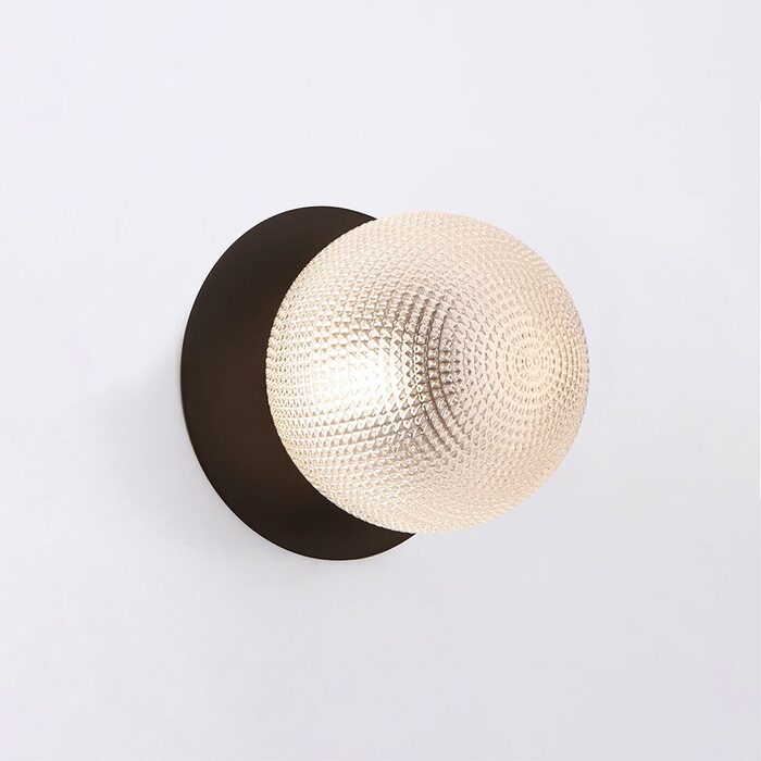 Each wall light pairs a sleek integrated LED module with your choice of round decorative base plate in Gold, Brass, Chrome, Matte White, or Matte Black, and a round glass shade available in Clear, Smoky, Marble Opal, or Frosted Opal, in 10 cm or 15 cm sizes.