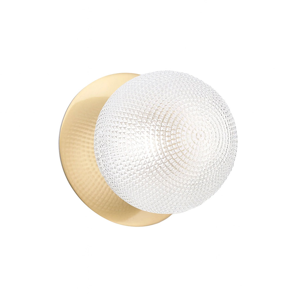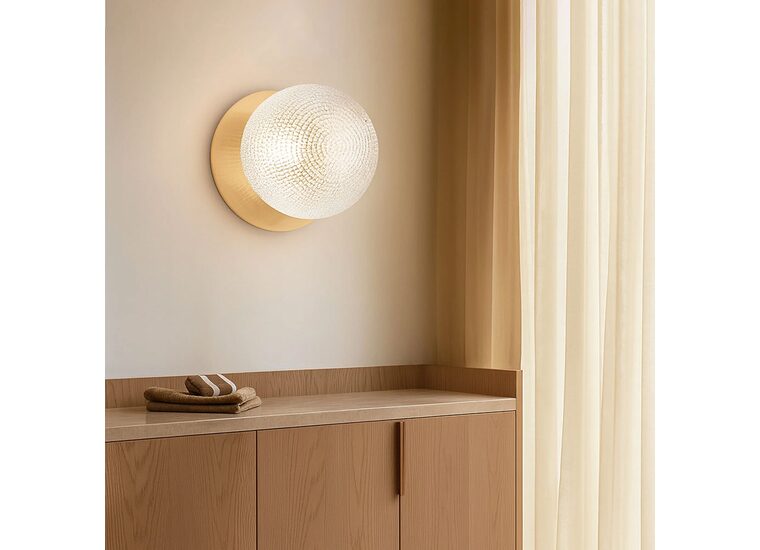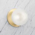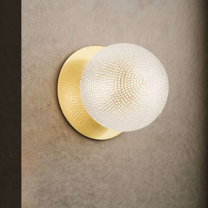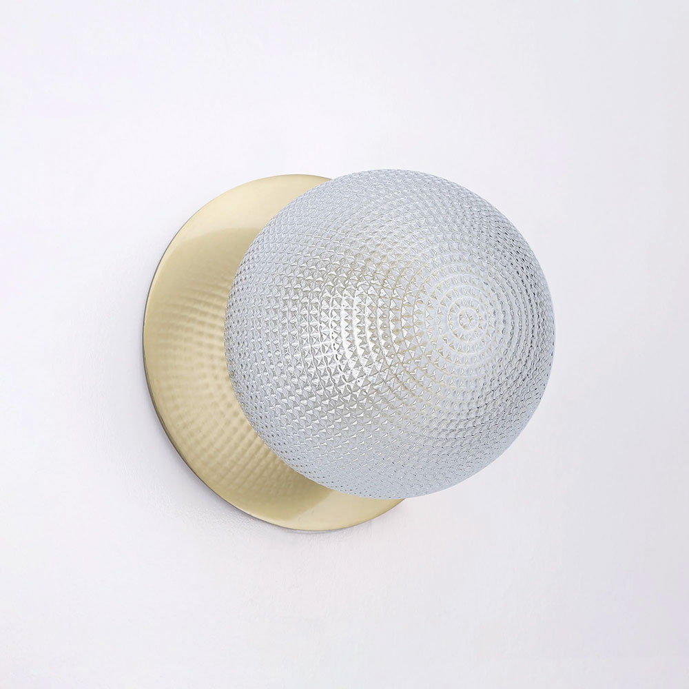 Each wall light pairs a sleek integrated LED module with your choice of round decorative base plate in Gold, Brass, Chrome, Matte White, or Matte Black, and a round glass shade available in Clear, Smoky, Marble Opal, or Frosted Opal, in 10 cm or 15 cm sizes.