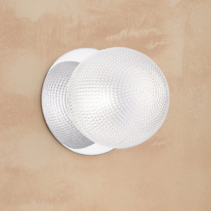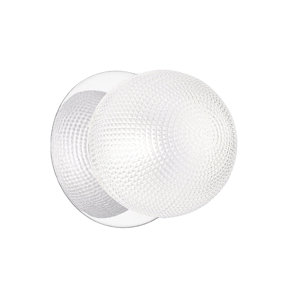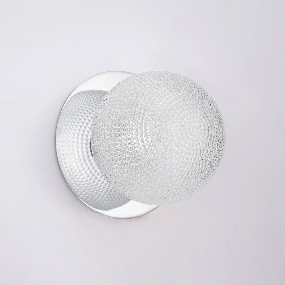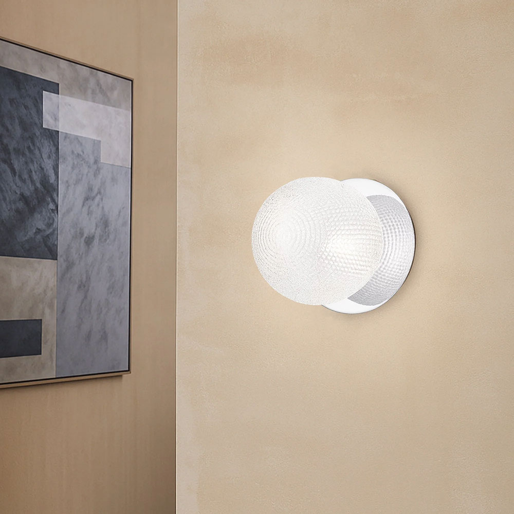 Each wall light pairs a sleek integrated LED module with your choice of round decorative base plate in Gold, Brass, Chrome, Matte White, or Matte Black, and a round glass shade available in Clear, Smoky, Marble Opal, or Frosted Opal, in 10 cm or 15 cm sizes.