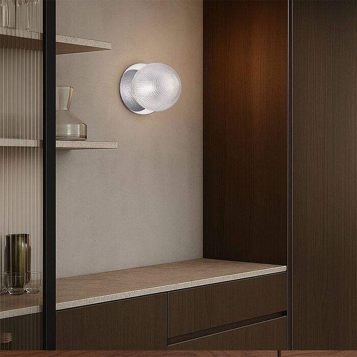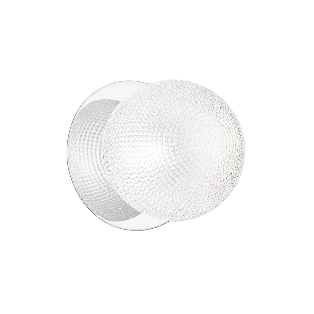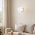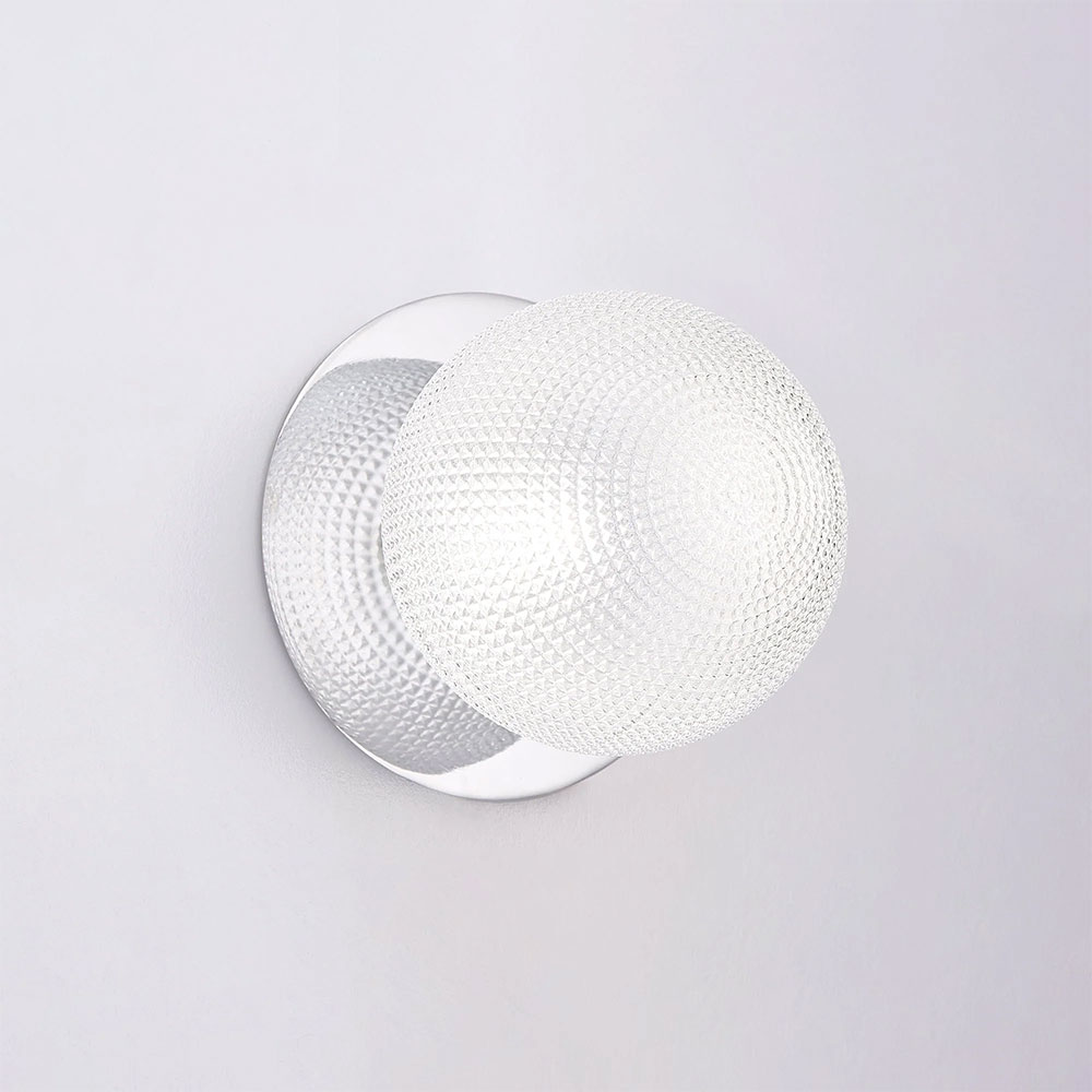 Each wall light pairs a sleek integrated LED module with your choice of round decorative base plate in Gold, Brass, Chrome, Matte White, or Matte Black, and a round glass shade available in Clear, Smoky, Marble Opal, or Frosted Opal, in 10 cm or 15 cm sizes.