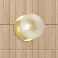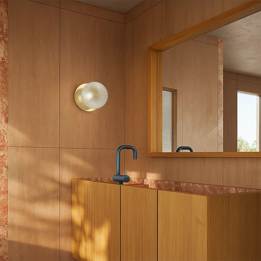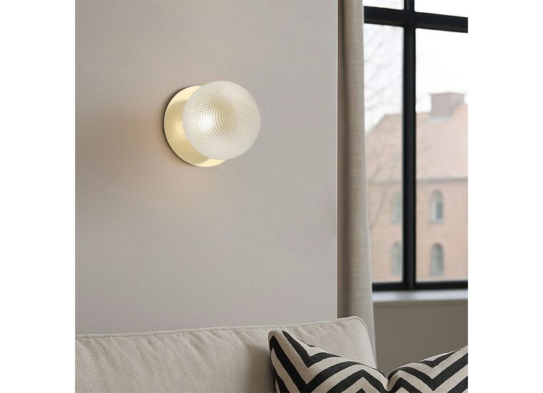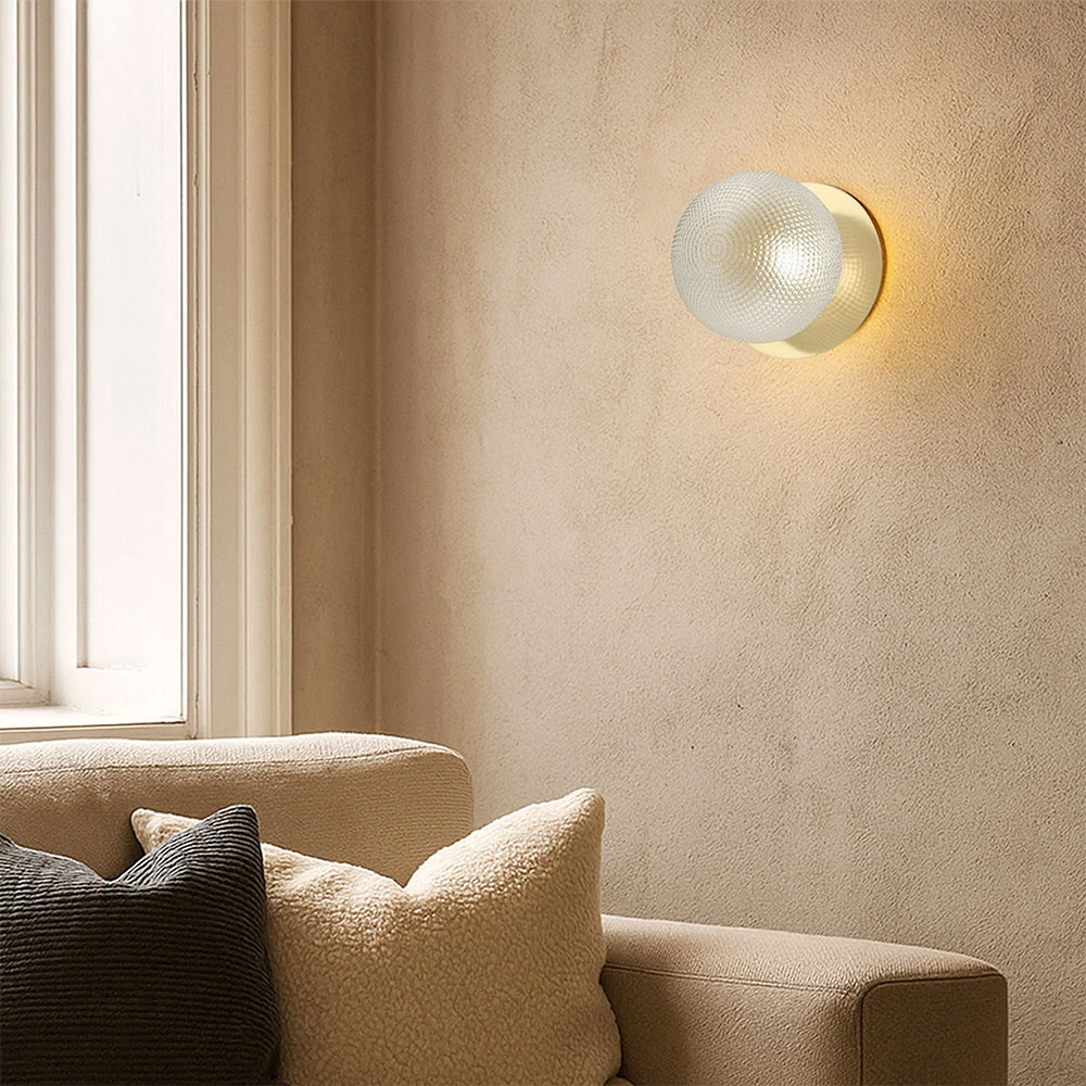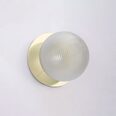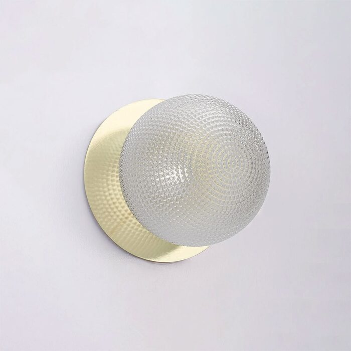 Each wall light pairs a sleek integrated LED module with your choice of round decorative base plate in Gold, Brass, Chrome, Matte White, or Matte Black, and a round glass shade available in Clear, Smoky, Marble Opal, or Frosted Opal, in 10 cm or 15 cm sizes.