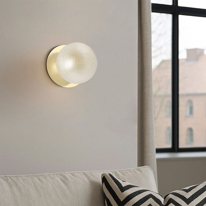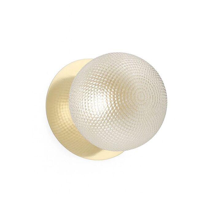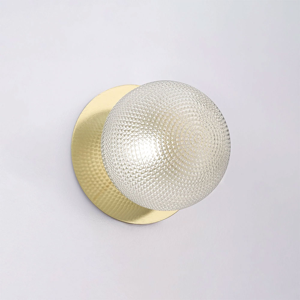 Each wall light pairs a sleek integrated LED module with your choice of round decorative base plate in Gold, Brass, Chrome, Matte White, or Matte Black, and a round glass shade available in Clear, Smoky, Marble Opal, or Frosted Opal, in 10 cm or 15 cm sizes.