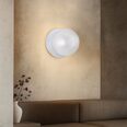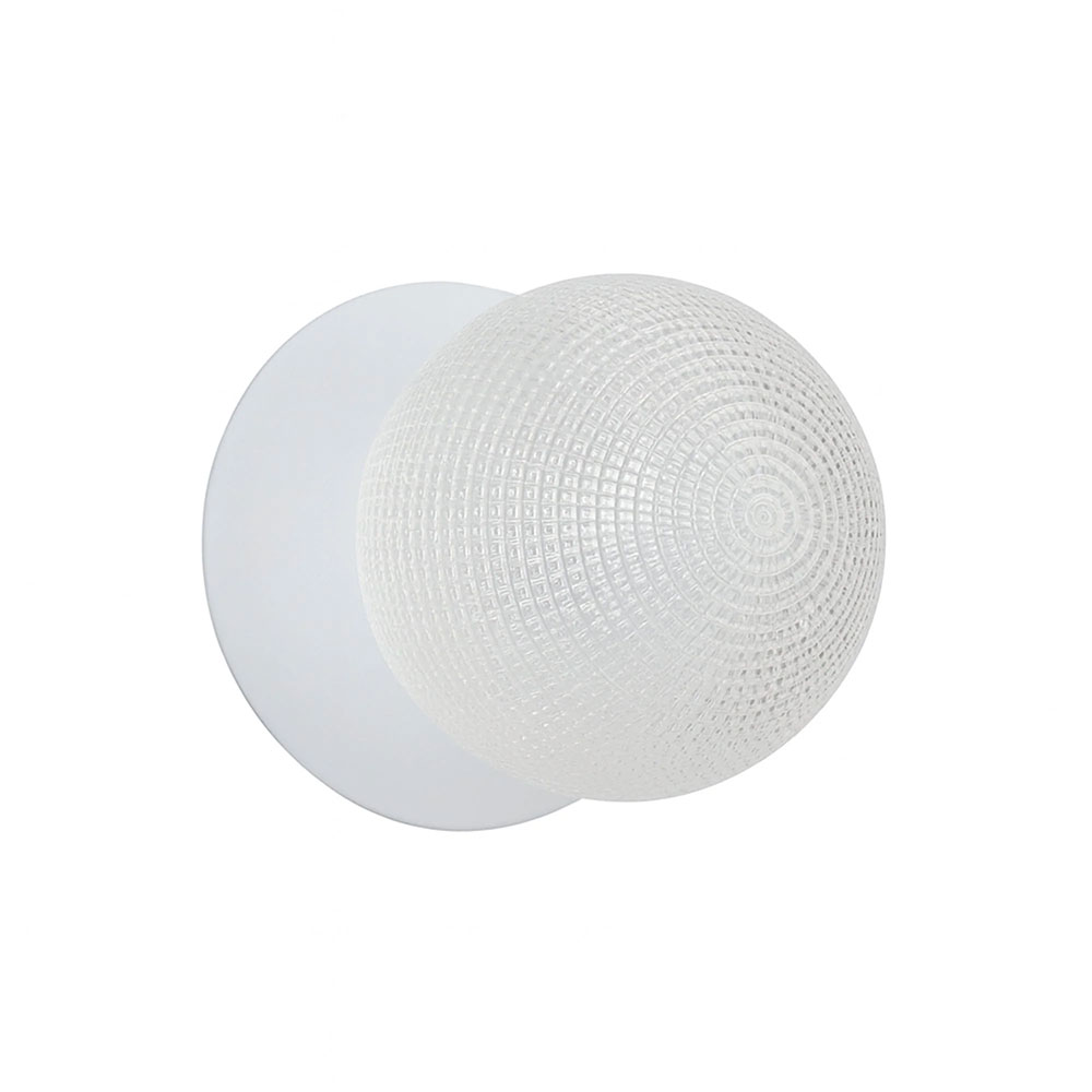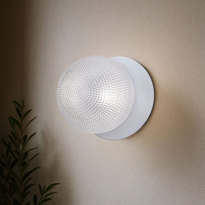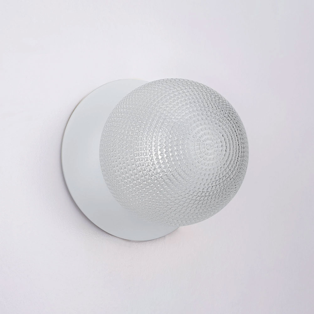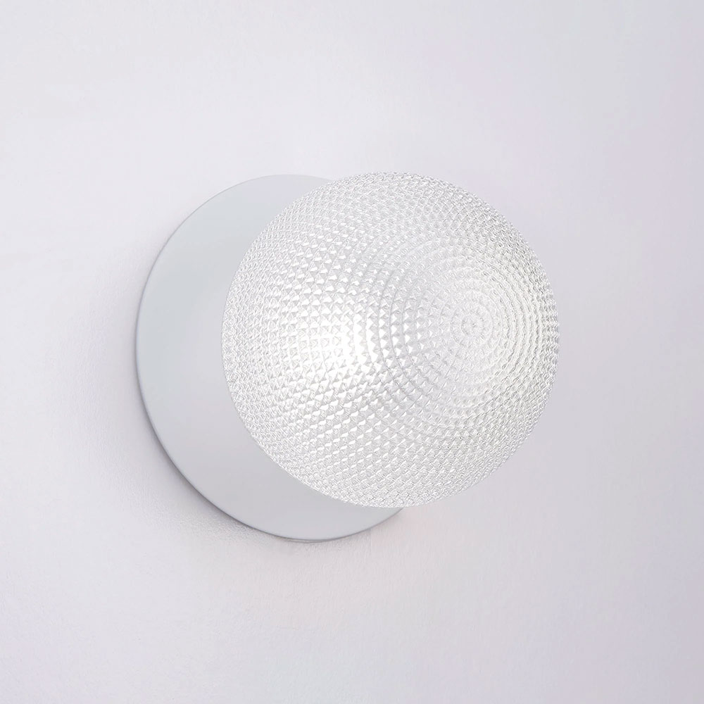 Each wall light pairs a sleek integrated LED module with your choice of round decorative base plate in Gold, Brass, Chrome, Matte White, or Matte Black, and a round glass shade available in Clear, Smoky, Marble Opal, or Frosted Opal, in 10 cm or 15 cm sizes.