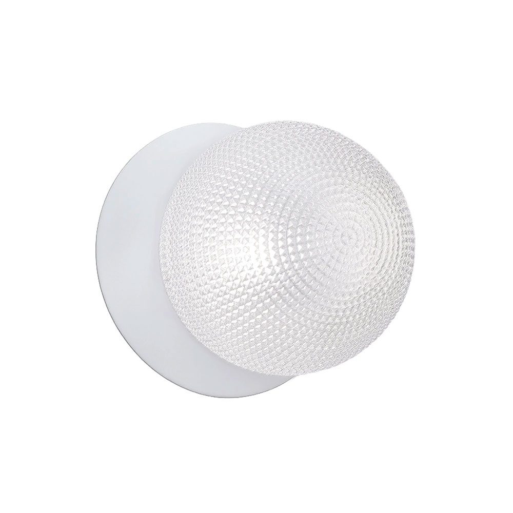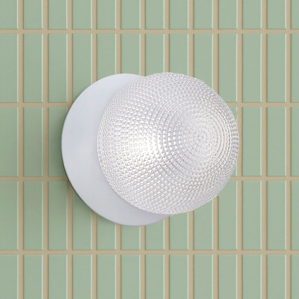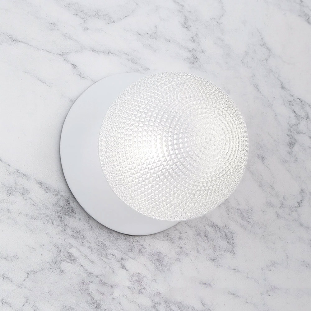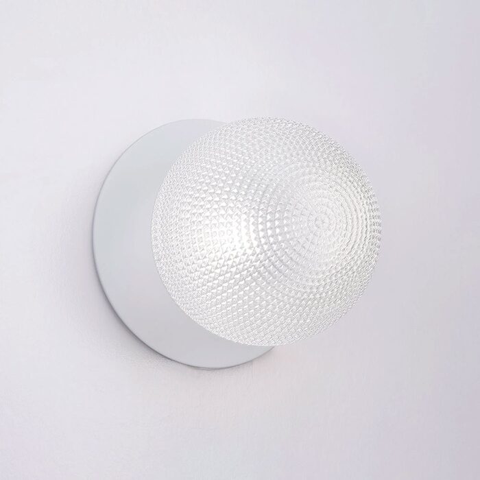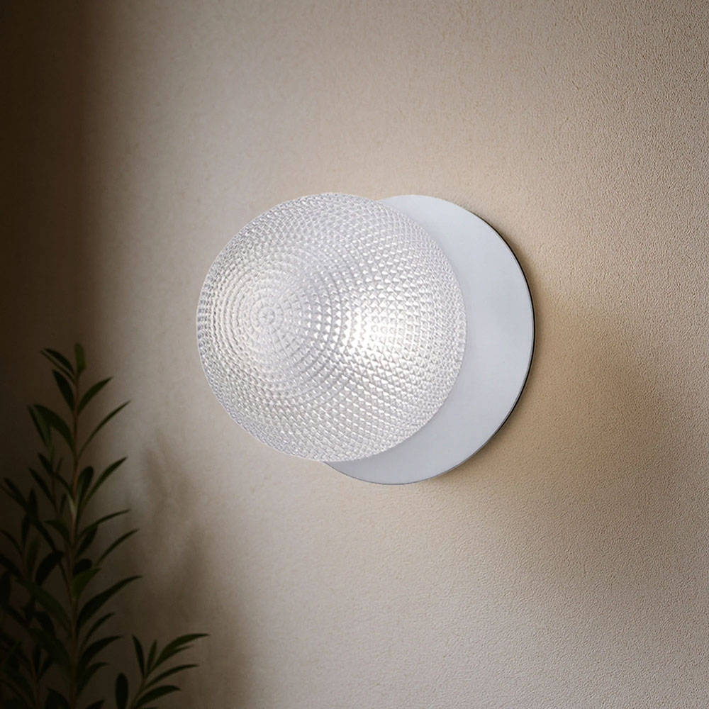 Each wall light pairs a sleek integrated LED module with your choice of round decorative base plate in Gold, Brass, Chrome, Matte White, or Matte Black, and a round glass shade available in Clear, Smoky, Marble Opal, or Frosted Opal, in 10 cm or 15 cm sizes.