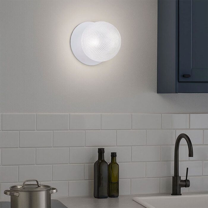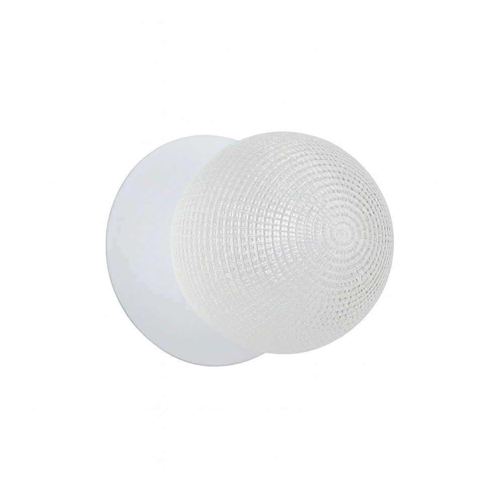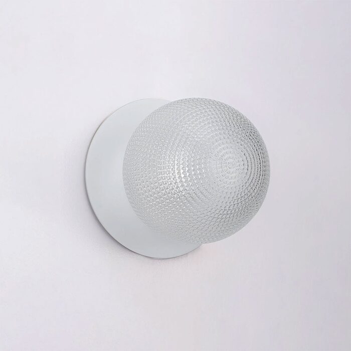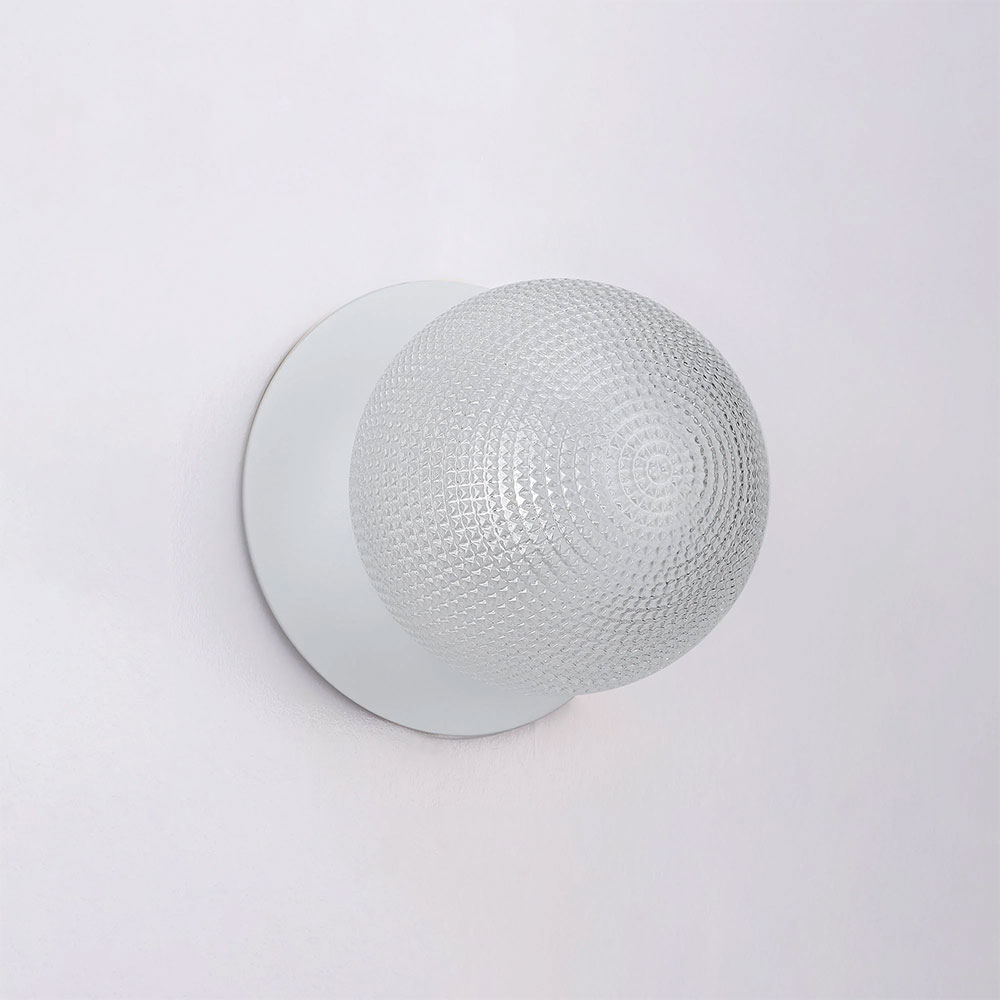 Each wall light pairs a sleek integrated LED module with your choice of round decorative base plate in Gold, Brass, Chrome, Matte White, or Matte Black, and a round glass shade available in Clear, Smoky, Marble Opal, or Frosted Opal, in 10 cm or 15 cm sizes.