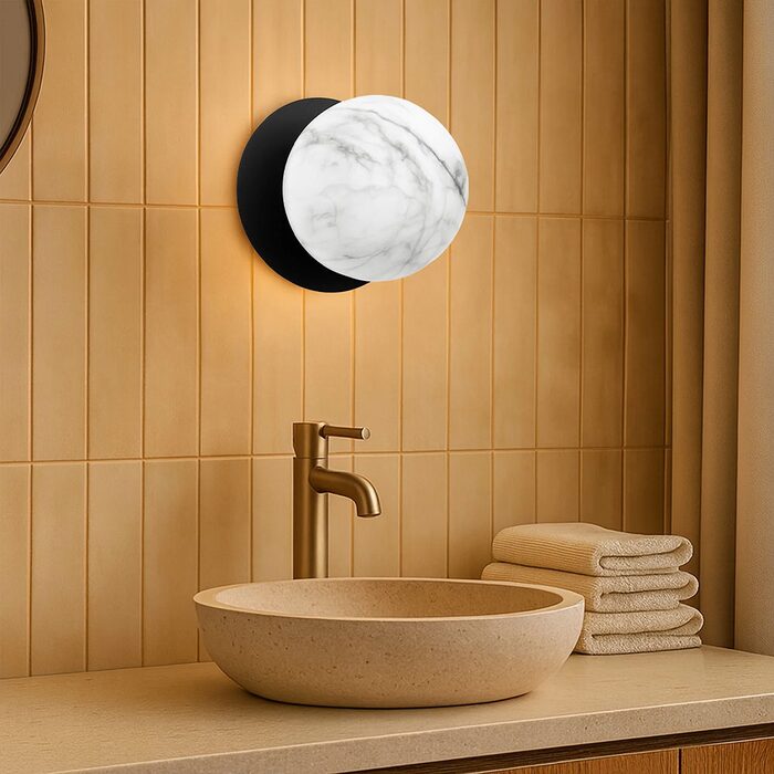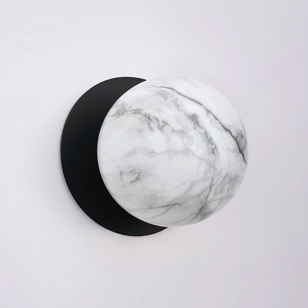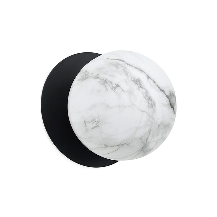 Each wall light pairs a sleek integrated LED module with your choice of round decorative base plate in Gold, Brass, Chrome, Matte White, or Matte Black, and a round glass shade available in Clear, Smoky, Marble Opal, or Frosted Opal, in 10 cm or 15 cm sizes.