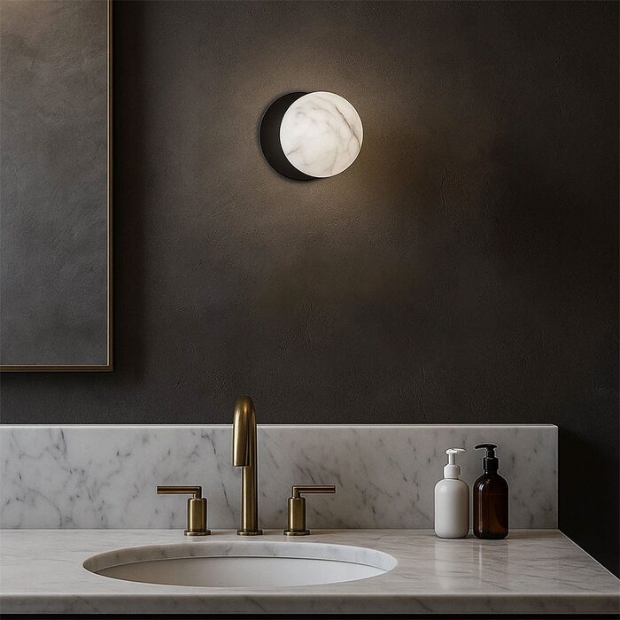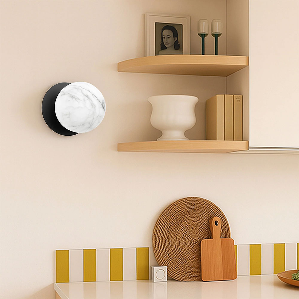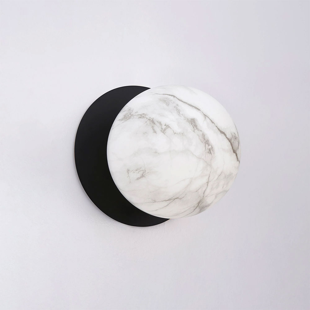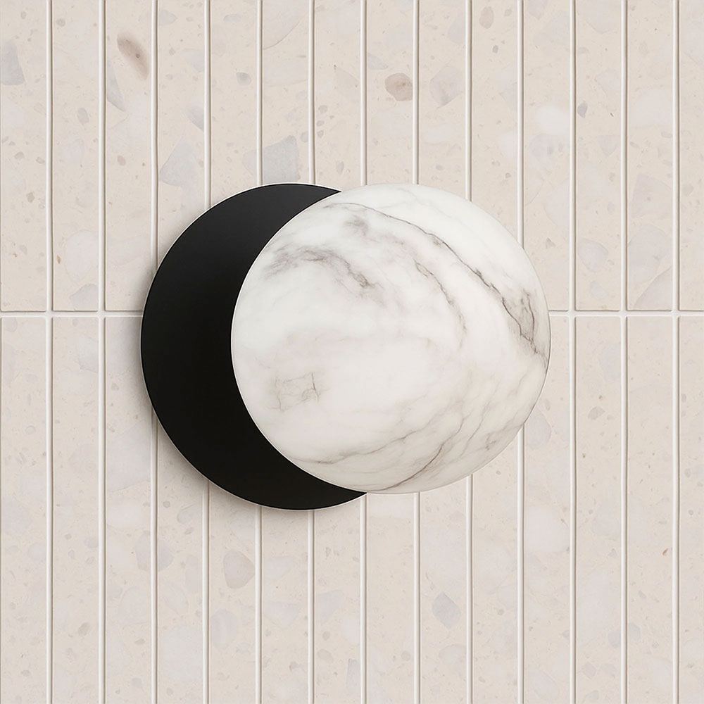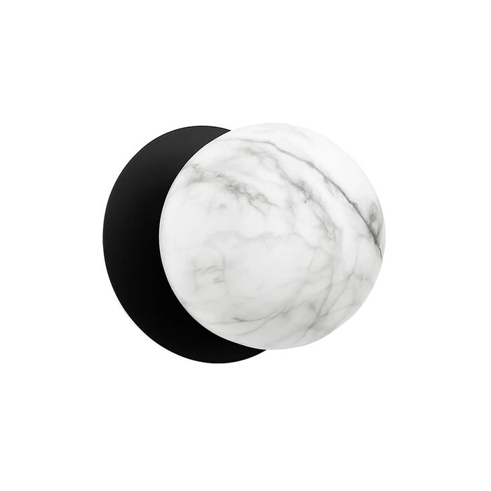 Each wall light pairs a sleek integrated LED module with your choice of round decorative base plate in Gold, Brass, Chrome, Matte White, or Matte Black, and a round glass shade available in Clear, Smoky, Marble Opal, or Frosted Opal, in 10 cm or 15 cm sizes.