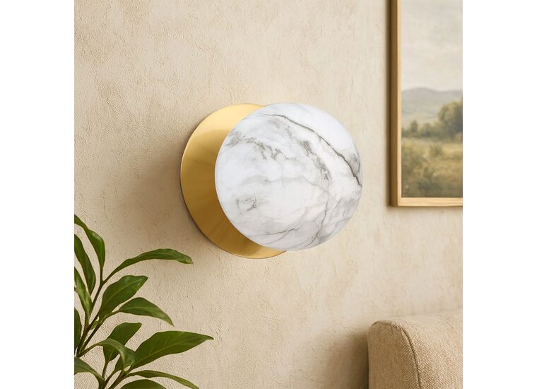 Each wall light pairs a sleek integrated LED module with your choice of round decorative base plate in Gold, Brass, Chrome, Matte White, or Matte Black, and a round glass shade available in Clear, Smoky, Marble Opal, or Frosted Opal, in 10 cm or 15 cm sizes.