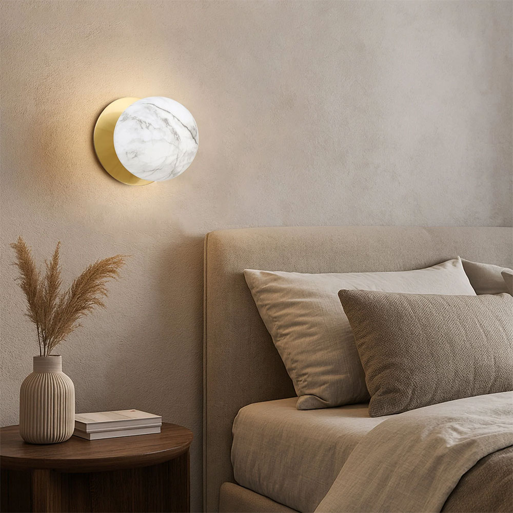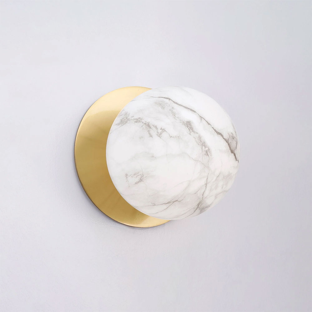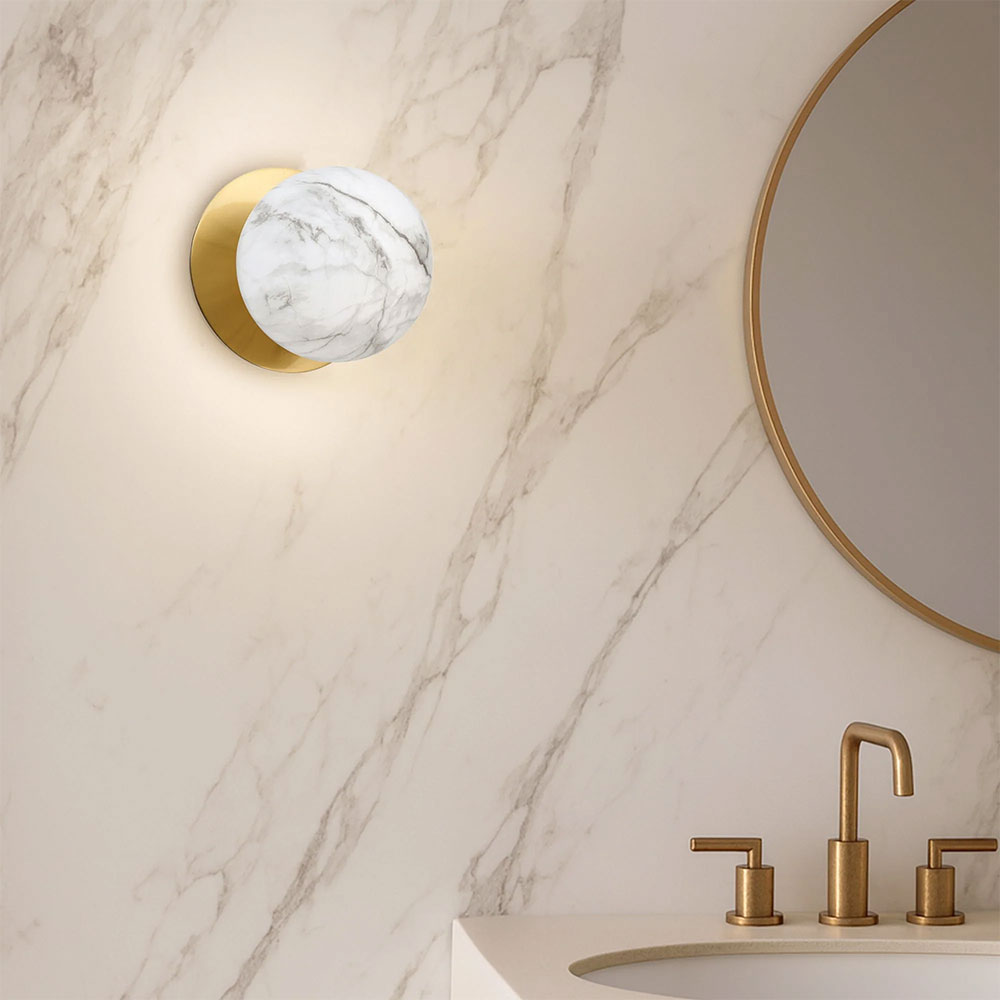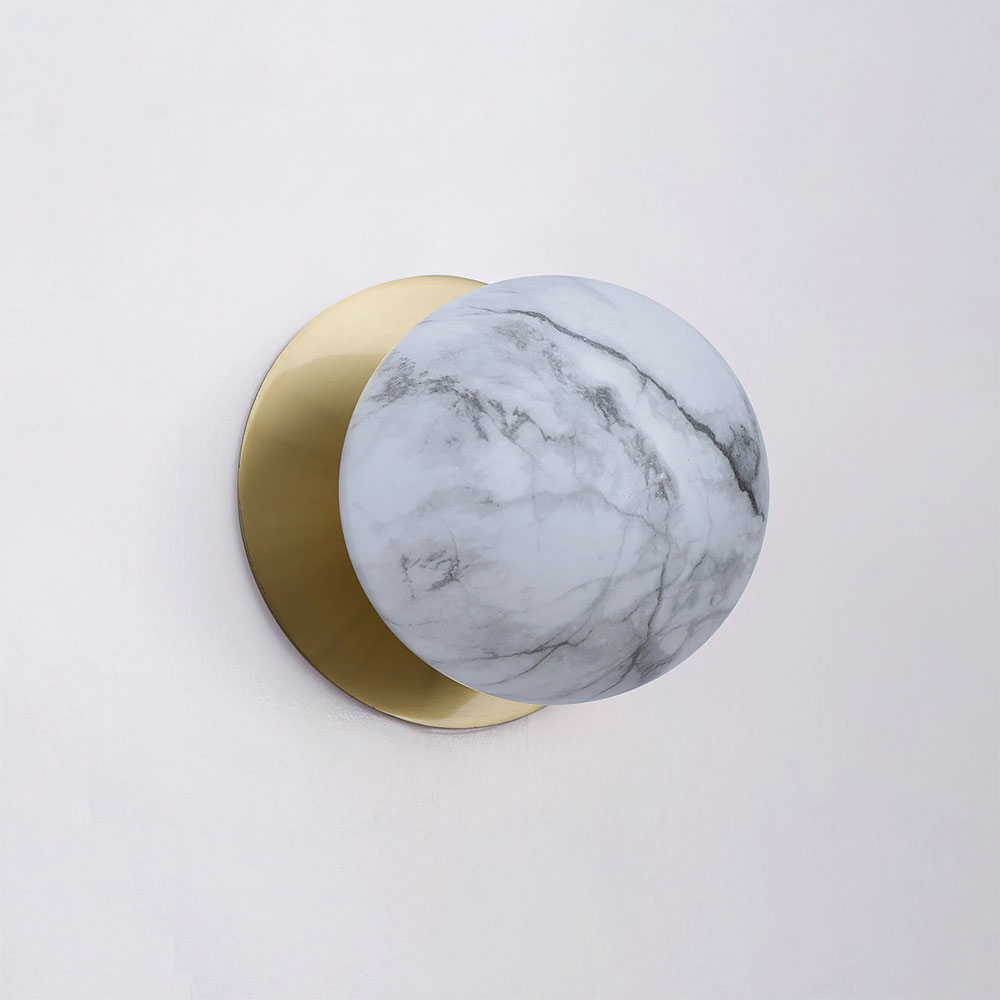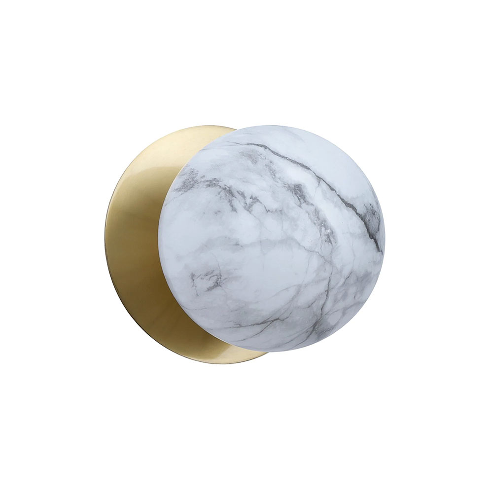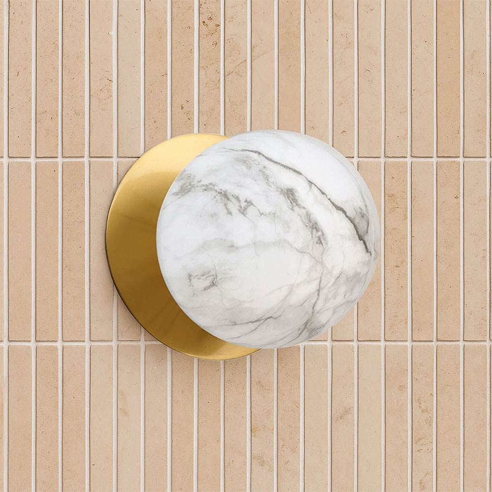 Each wall light pairs a sleek integrated LED module with your choice of round decorative base plate in Gold, Brass, Chrome, Matte White, or Matte Black, and a round glass shade available in Clear, Smoky, Marble Opal, or Frosted Opal, in 10 cm or 15 cm sizes.