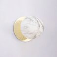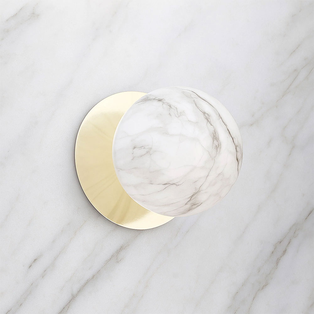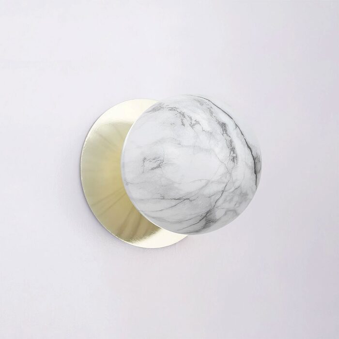 Each wall light pairs a sleek integrated LED module with your choice of round decorative base plate in Gold, Brass, Chrome, Matte White, or Matte Black, and a round glass shade available in Clear, Smoky, Marble Opal, or Frosted Opal, in 10 cm or 15 cm sizes.