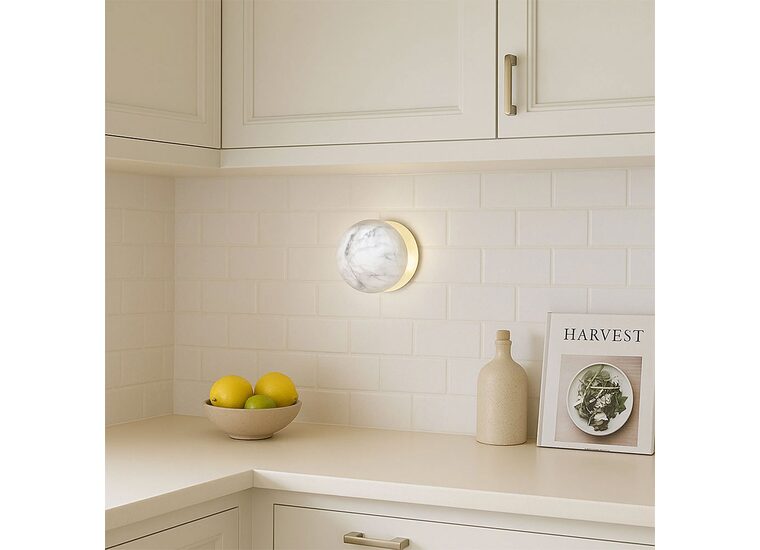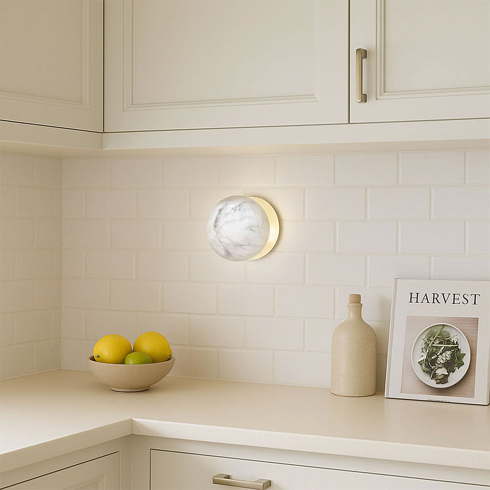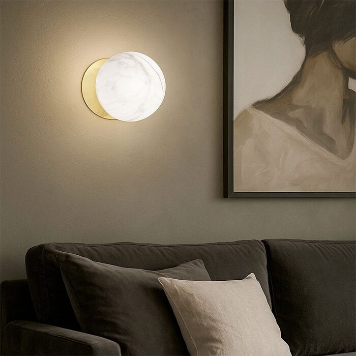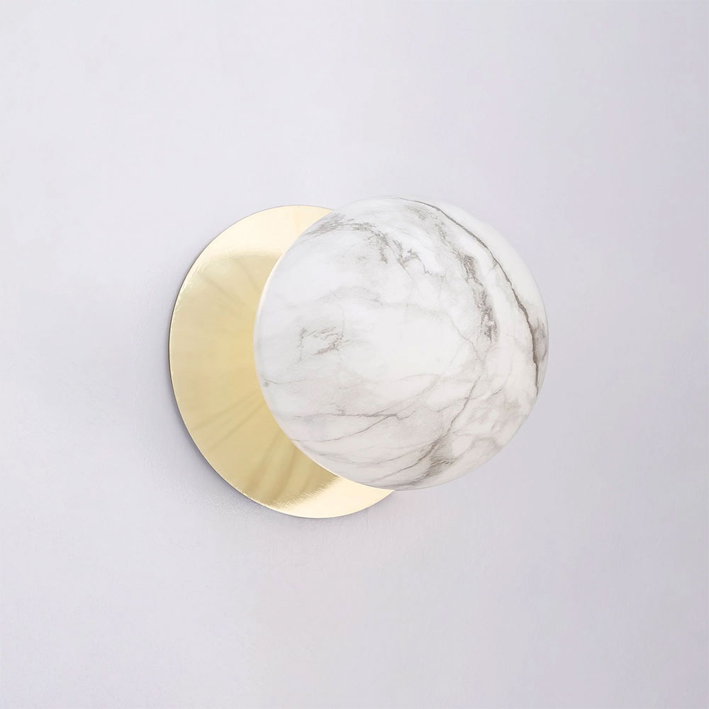 Each wall light pairs a sleek integrated LED module with your choice of round decorative base plate in Gold, Brass, Chrome, Matte White, or Matte Black, and a round glass shade available in Clear, Smoky, Marble Opal, or Frosted Opal, in 10 cm or 15 cm sizes.