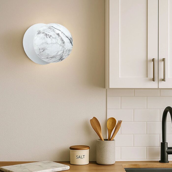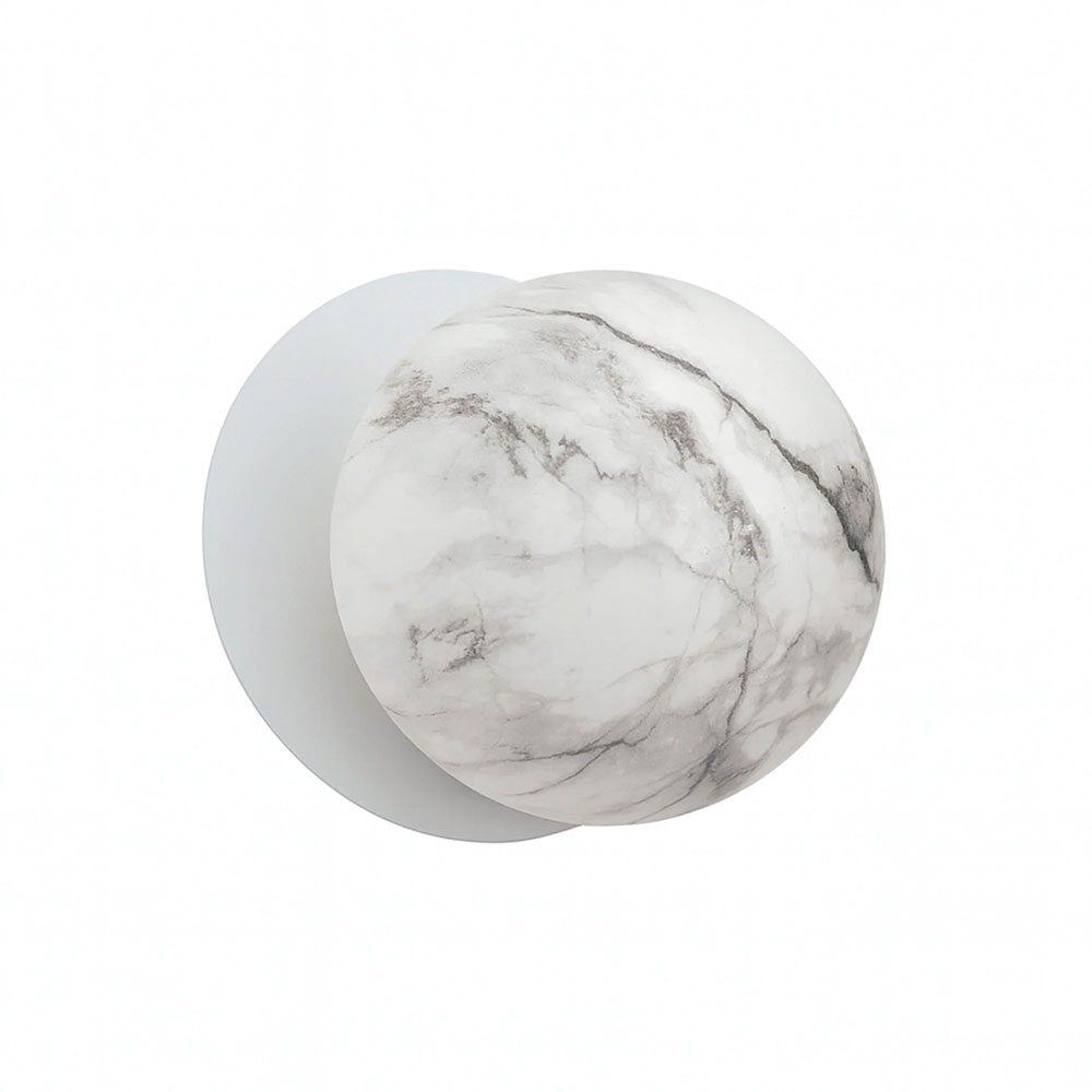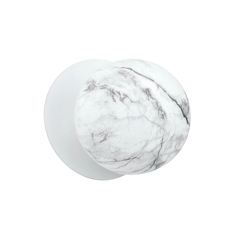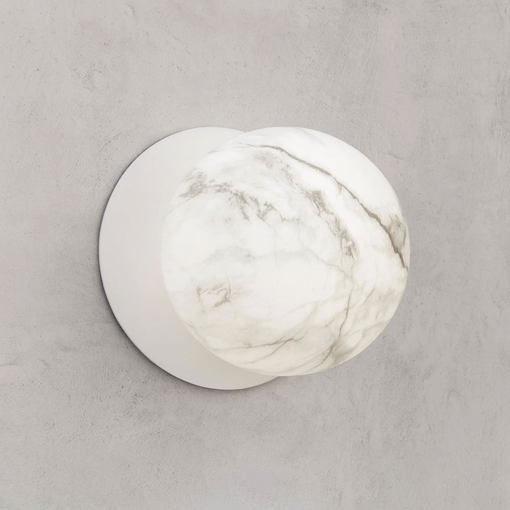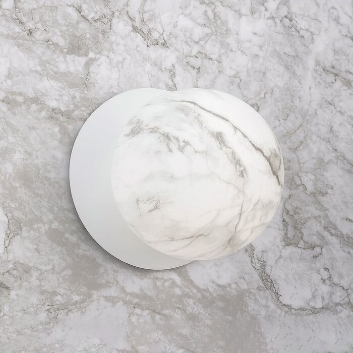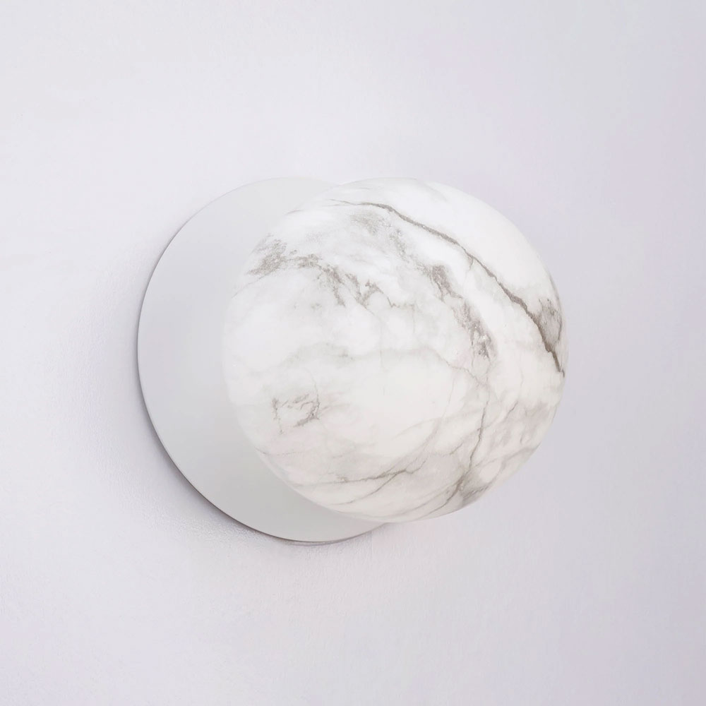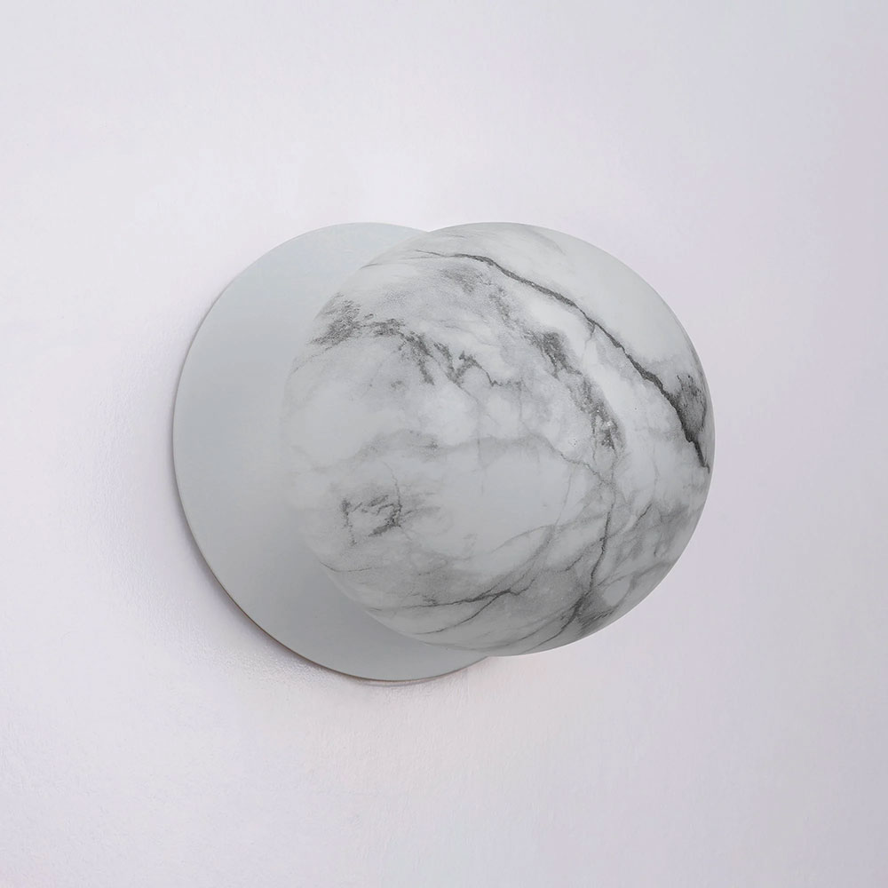 Each wall light pairs a sleek integrated LED module with your choice of round decorative base plate in Gold, Brass, Chrome, Matte White, or Matte Black, and a round glass shade available in Clear, Smoky, Marble Opal, or Frosted Opal, in 10 cm or 15 cm sizes.