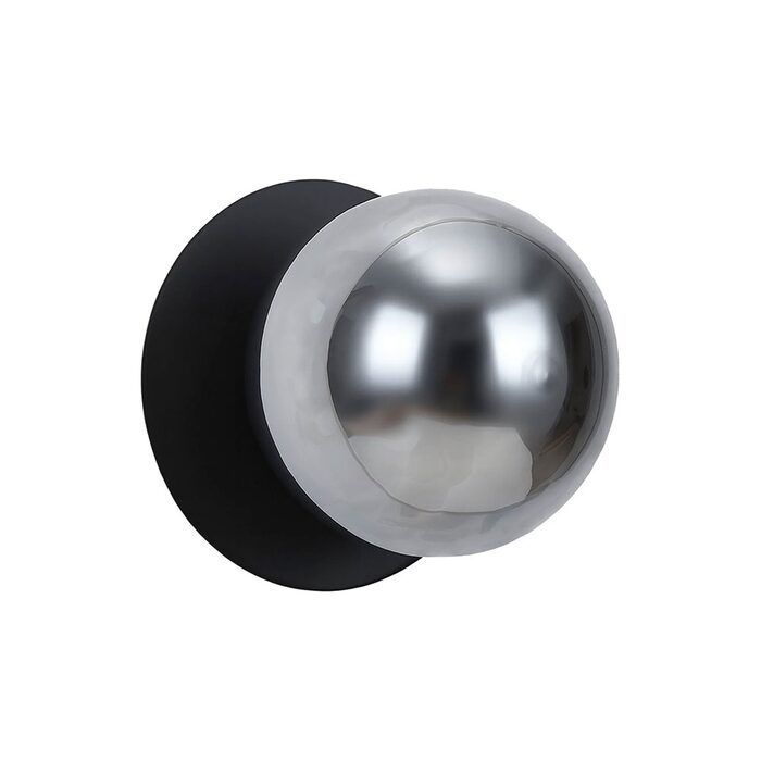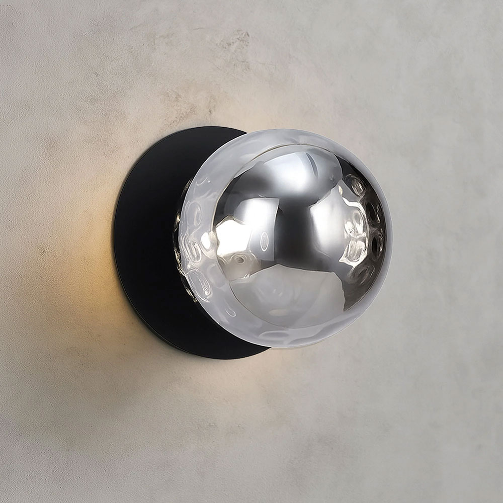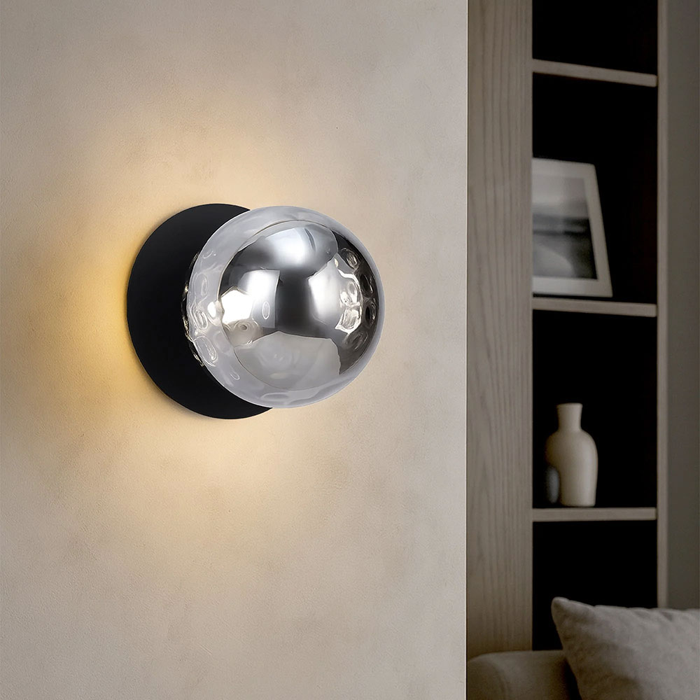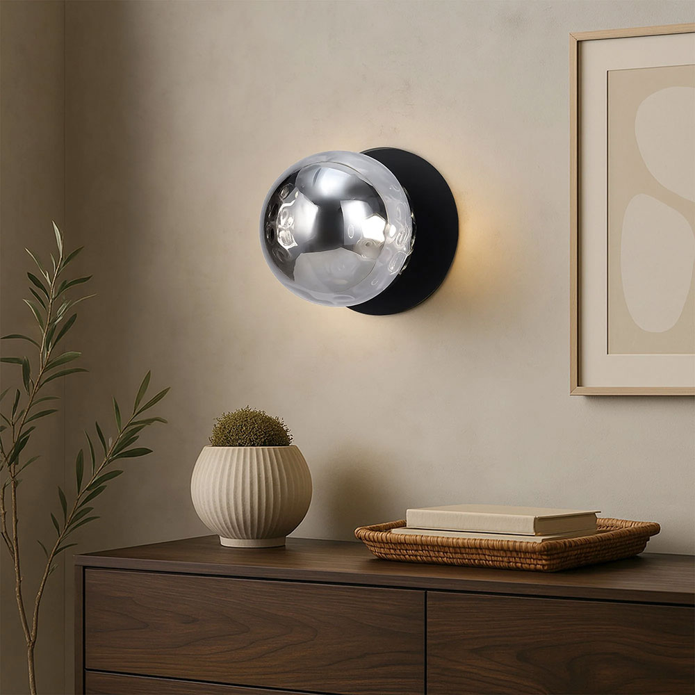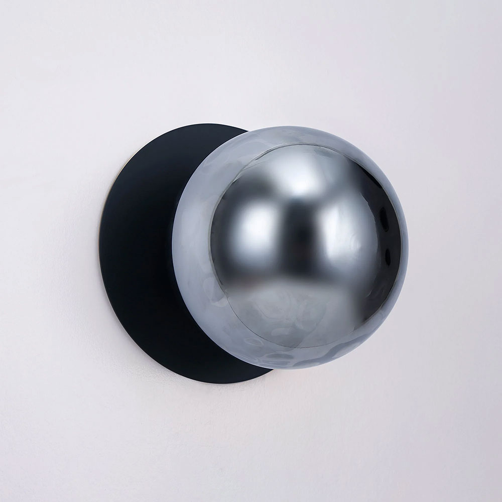 Each wall light pairs a sleek integrated LED module with your choice of round decorative base plate in Gold, Brass, Chrome, Matte White, or Matte Black, and a round glass shade available in Clear, Smoky, Marble Opal, or Frosted Opal, in 10 cm or 15 cm sizes.
