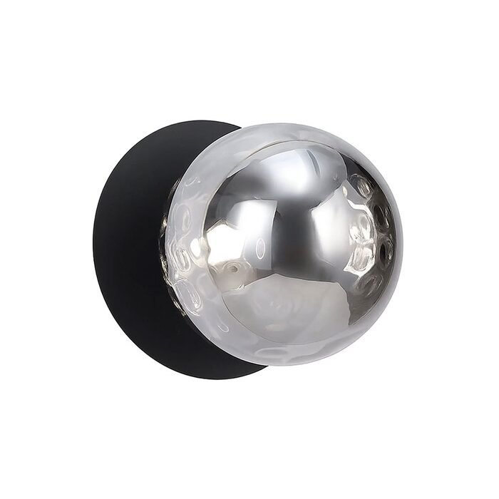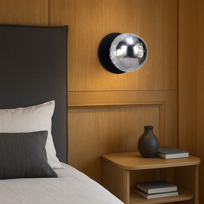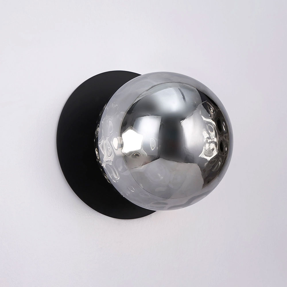 Each wall light pairs a sleek integrated LED module with your choice of round decorative base plate in Gold, Brass, Chrome, Matte White, or Matte Black, and a round glass shade available in Clear, Smoky, Marble Opal, or Frosted Opal, in 10 cm or 15 cm sizes.