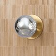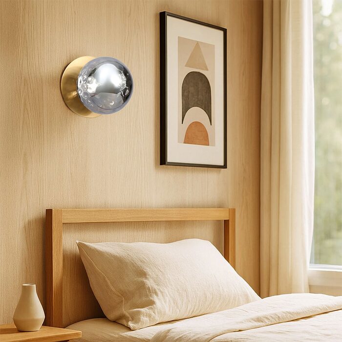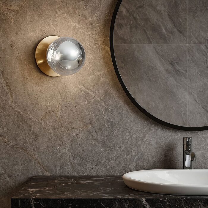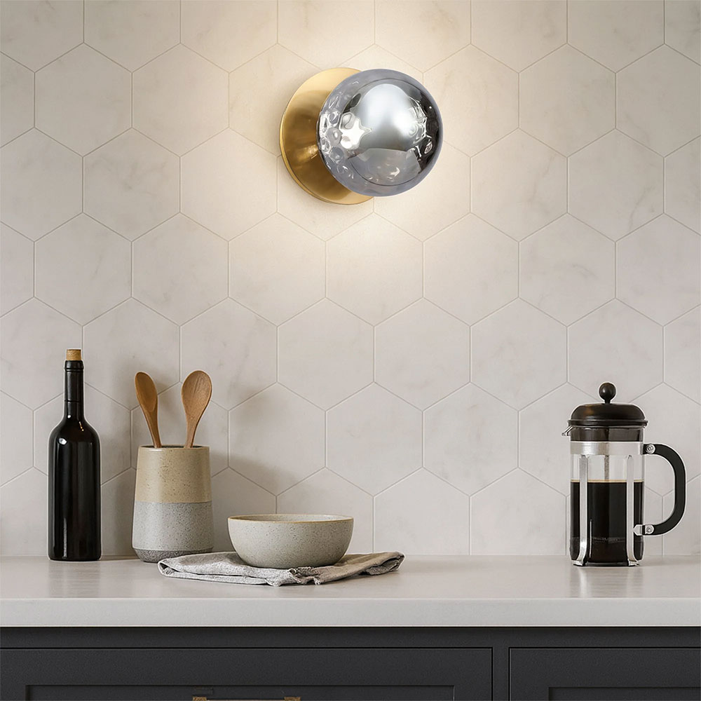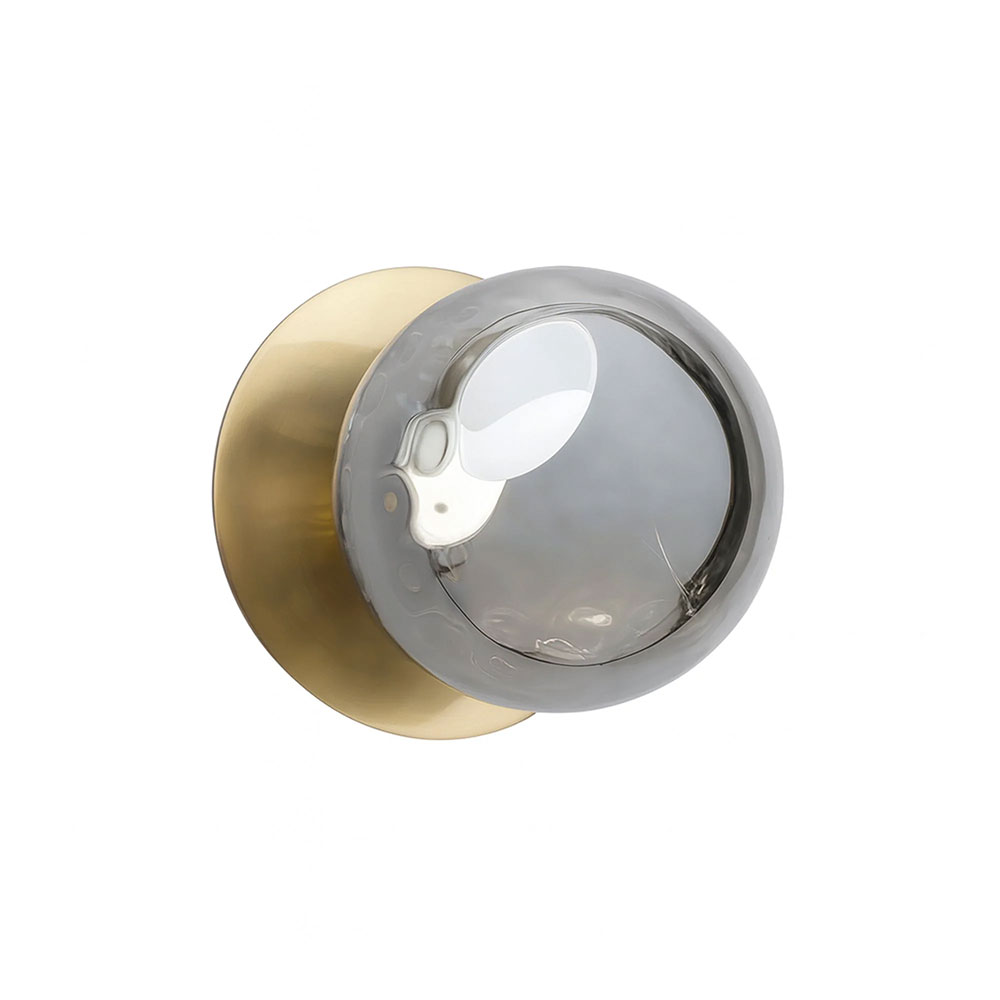 Each wall light pairs a sleek integrated LED module with your choice of round decorative base plate in Gold, Brass, Chrome, Matte White, or Matte Black, and a round glass shade available in Clear, Smoky, Marble Opal, or Frosted Opal, in 10 cm or 15 cm sizes.