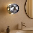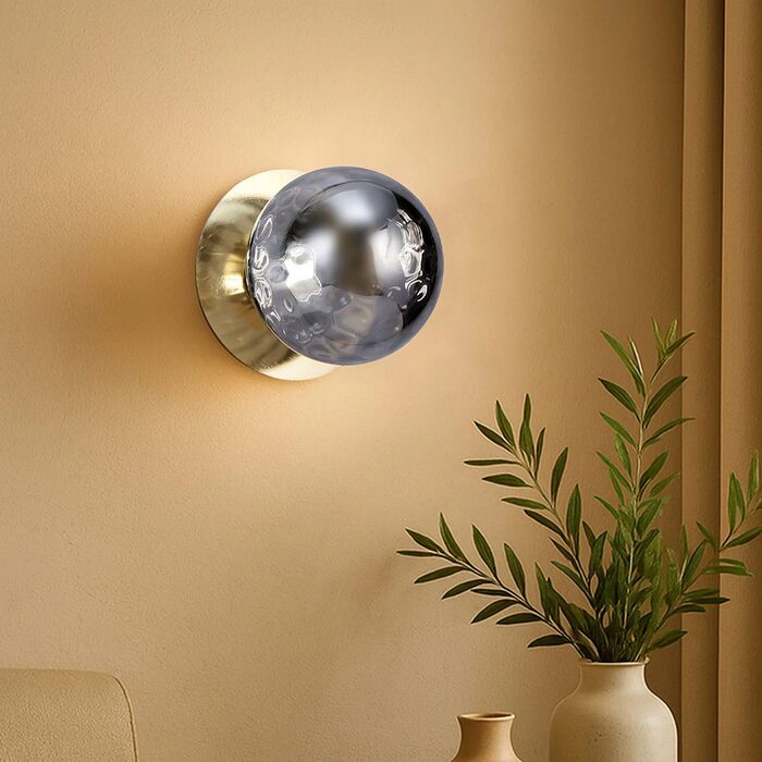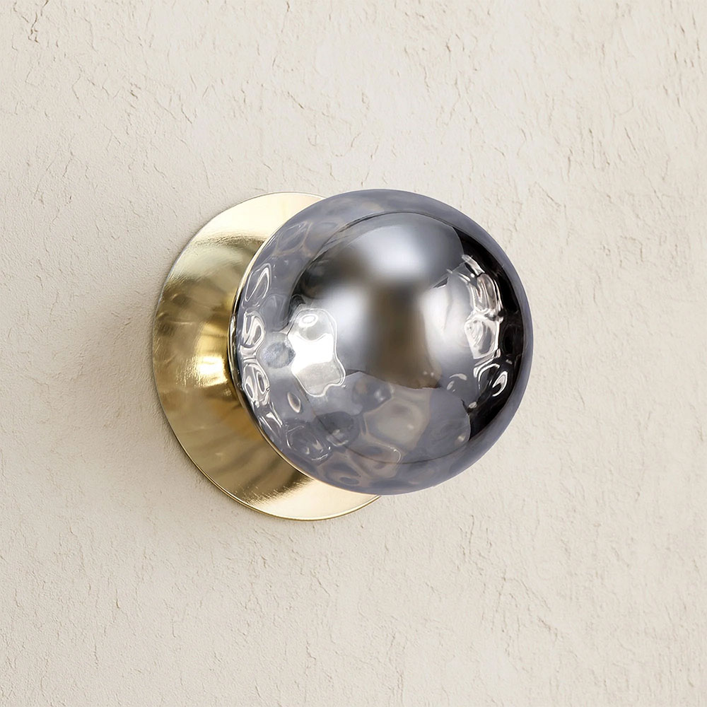 Each wall light pairs a sleek integrated LED module with your choice of round decorative base plate in Gold, Brass, Chrome, Matte White, or Matte Black, and a round glass shade available in Clear, Smoky, Marble Opal, or Frosted Opal, in 10 cm or 15 cm sizes.