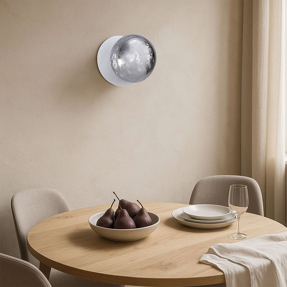 Each wall light pairs a sleek integrated LED module with your choice of round decorative base plate in Gold, Brass, Chrome, Matte White, or Matte Black, and a round glass shade available in Clear, Smoky, Marble Opal, or Frosted Opal, in 10 cm or 15 cm sizes.